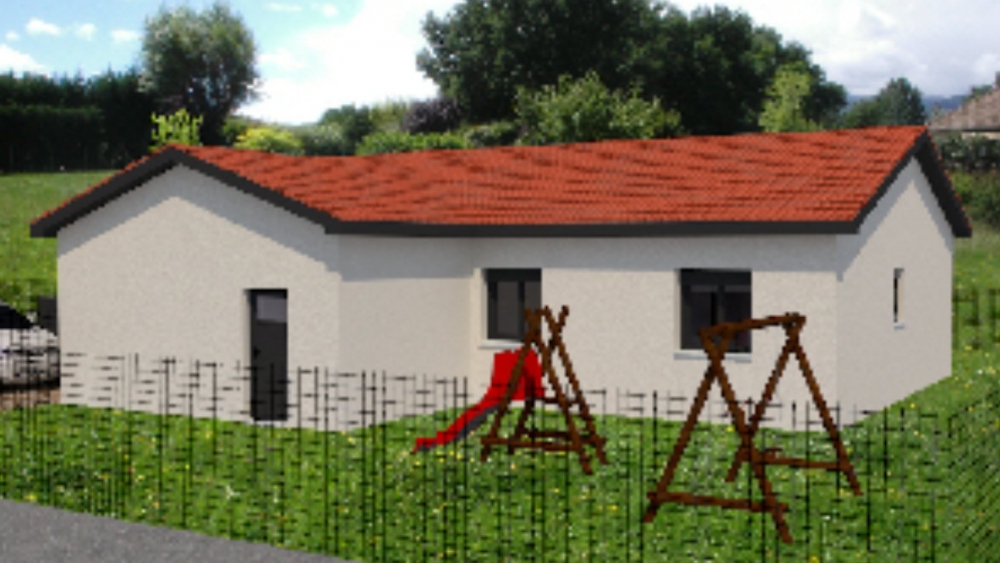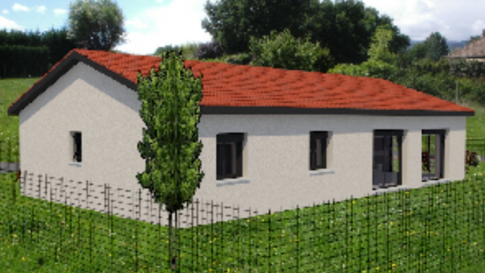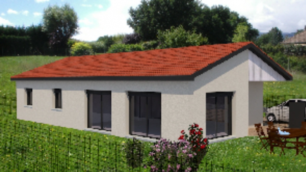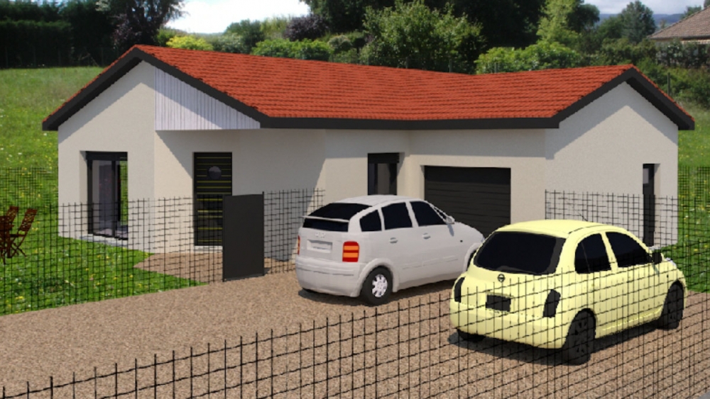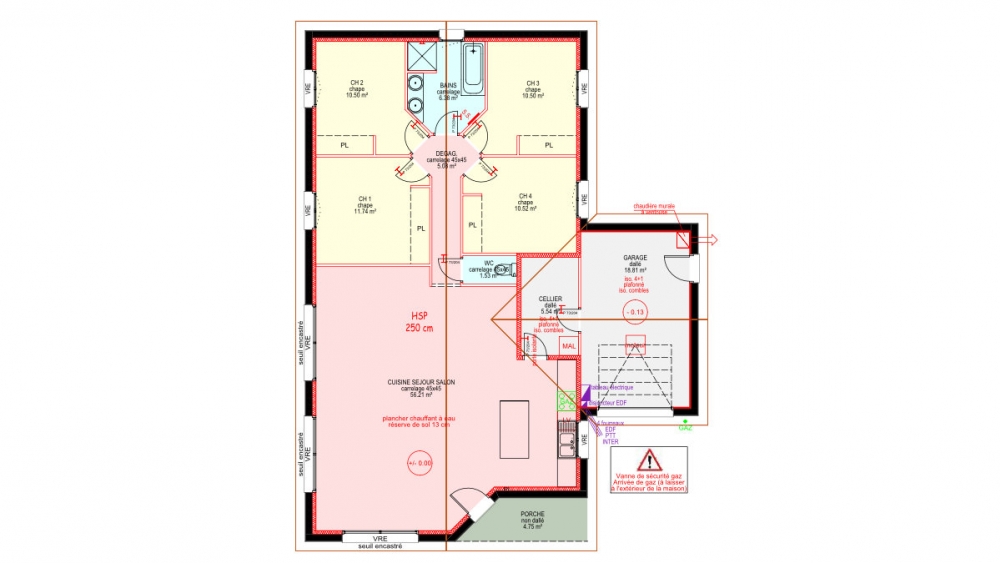 Maison de plain pied avec 4 chambres, une cuisine ouverte sur un grand séjour, un cellier, un garage et un porche.