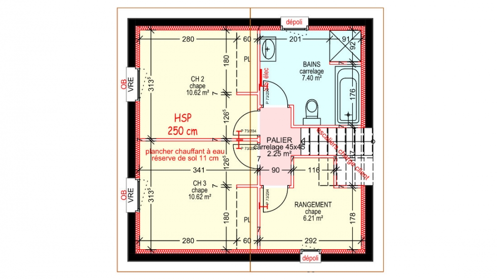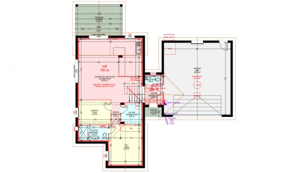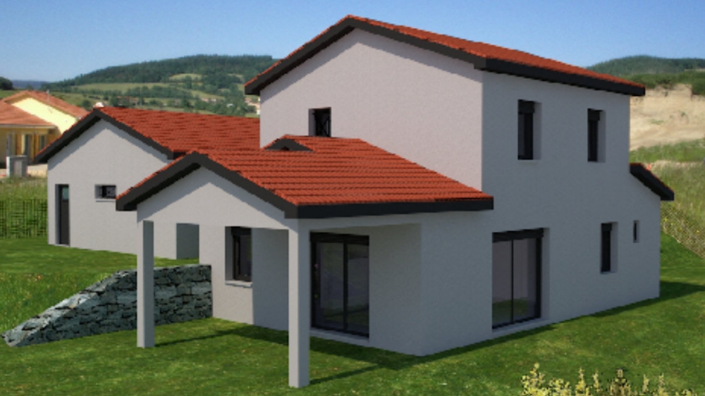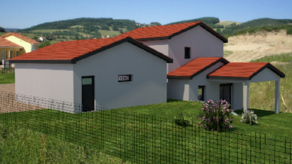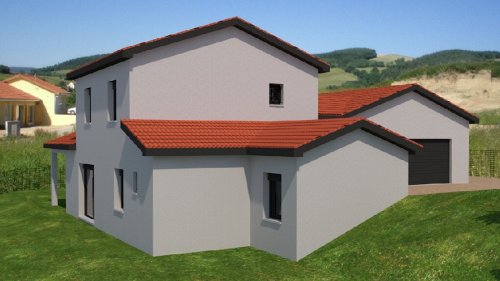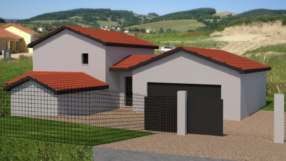 Maison avec étage comportant 3 chambres, un bureau, une pièce de rangement, 2 salles de bains, 2 WC, une cuisine ouverte sur un séjour, un cellier, une entrée, un grand garage, un porche et une terrasse.