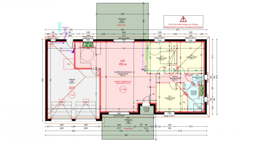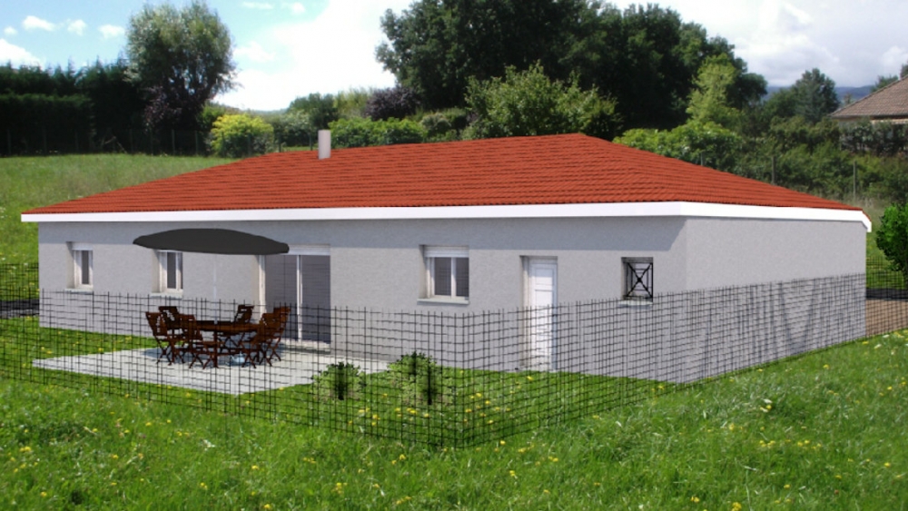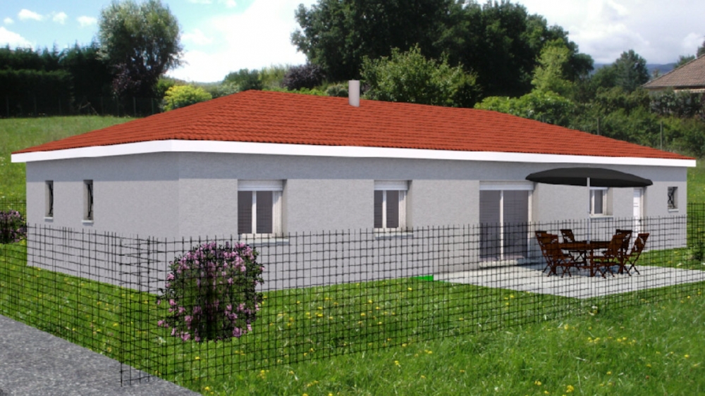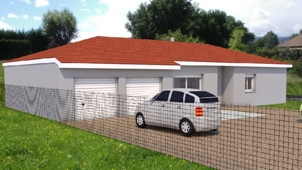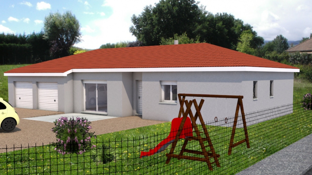 Maison de plain pied avec 3 chambres, une cuisine ouverte sur un grand séjour, un porche, un garage double et 2 terrasses.