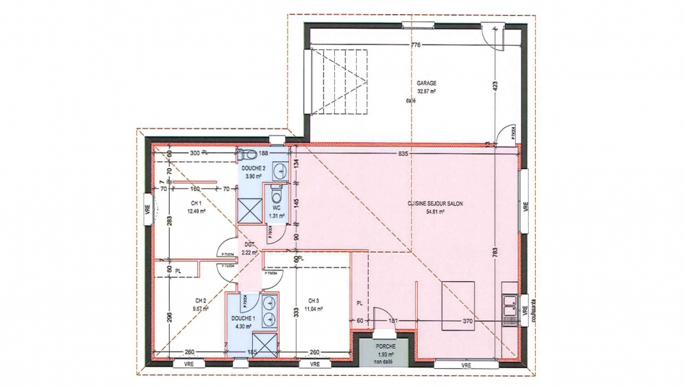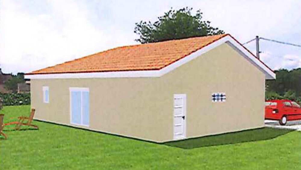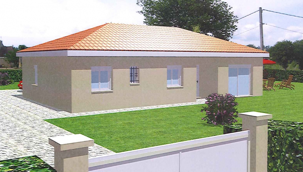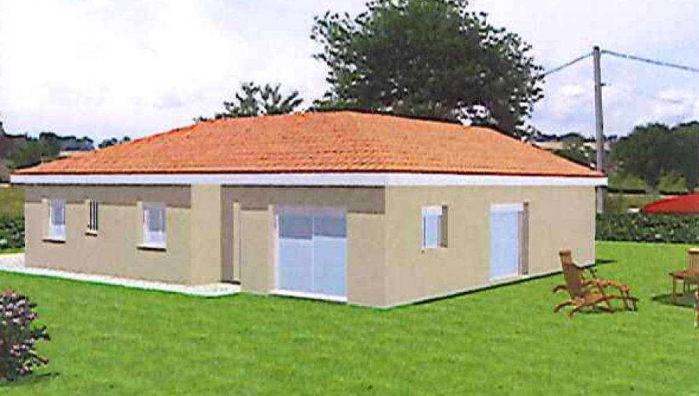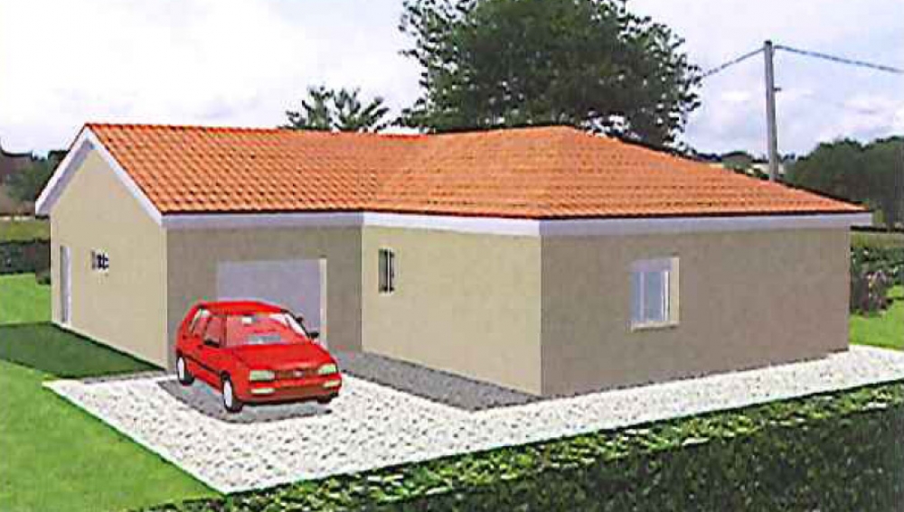 Maison de plain pied avec 3 chambres, 2 salles de bains, une cuisine ouverte sur un grand séjour, un porche et un grand garage.