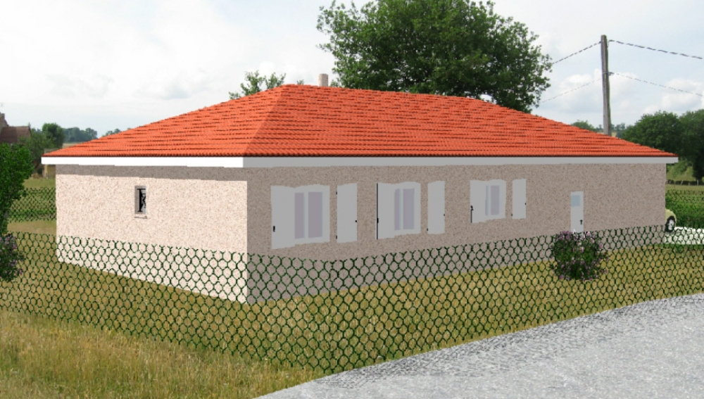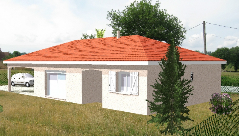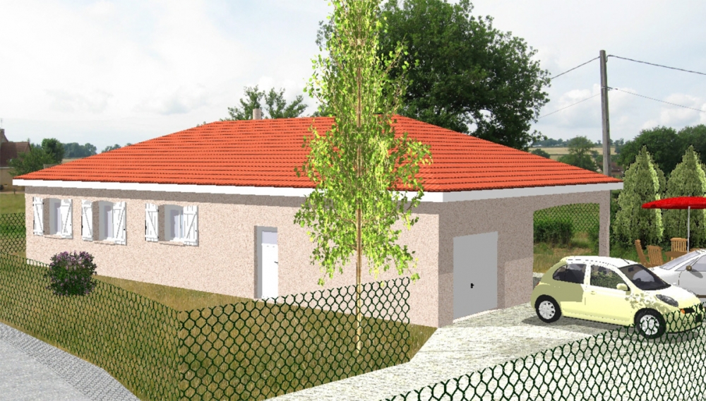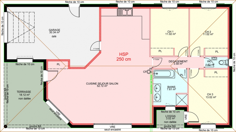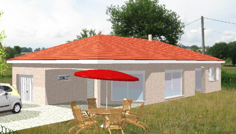Maison de plain pied avec 3 chambres, une cuisine ouverte sur un grand séjour, une loggia, une terrasse et un garage.