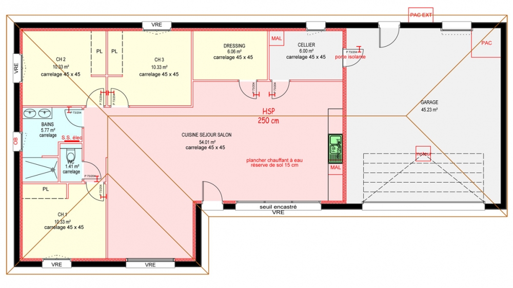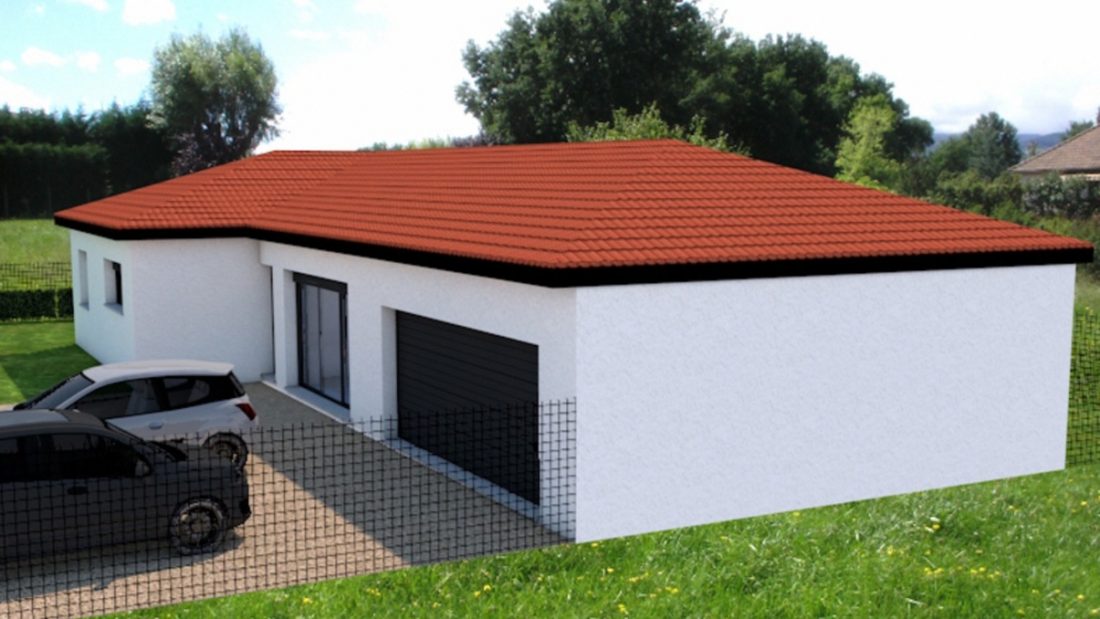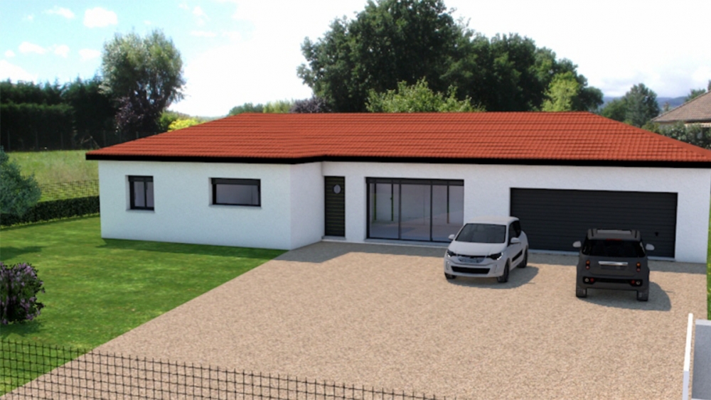 Maison de plain pied avec 3 chambres, un dressing, un cellier, un grand séjour avec cuisine ouverte et un grand garage.