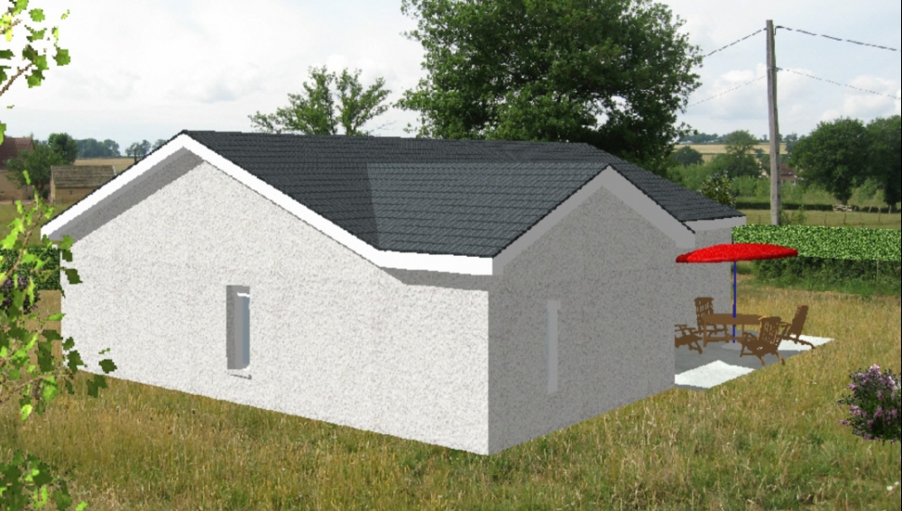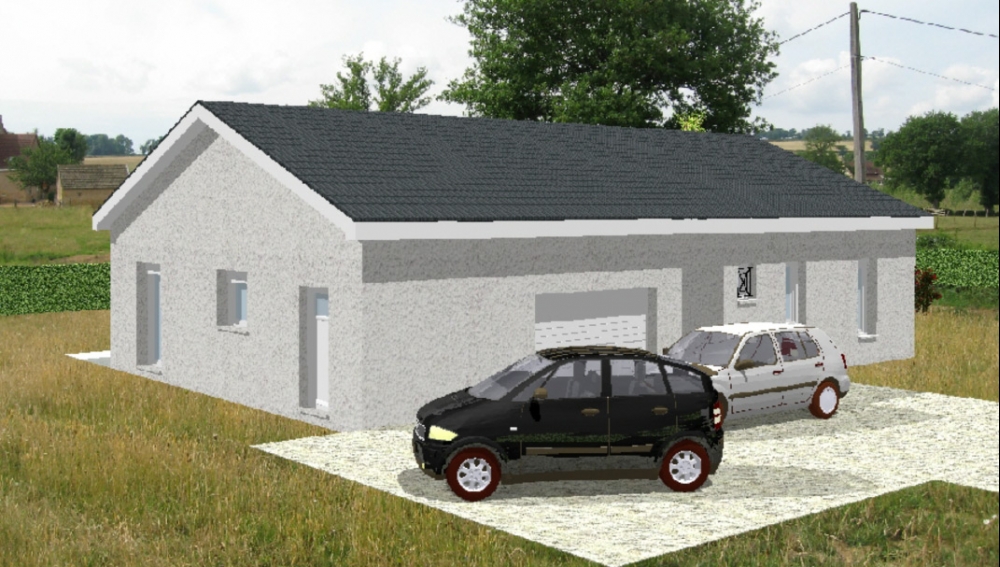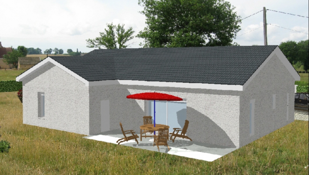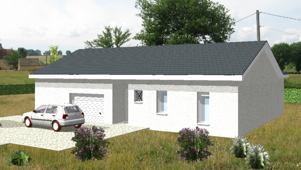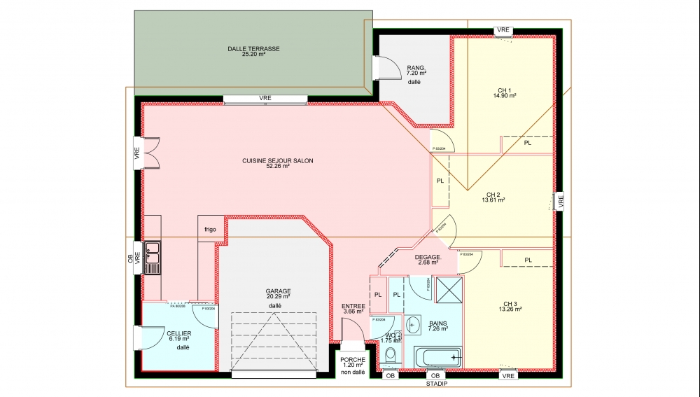 Maison de plain pied avec 3 chambres, un cellier, une pièce de rangement, une cuisine ouverte sur un grand séjour, un porche, une terrasse et un garage.
