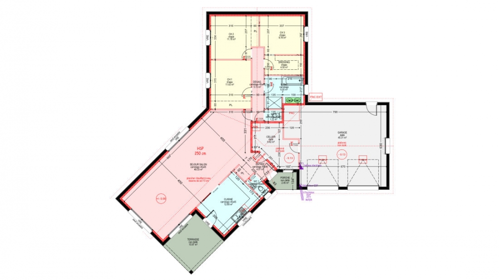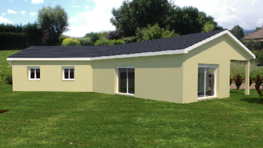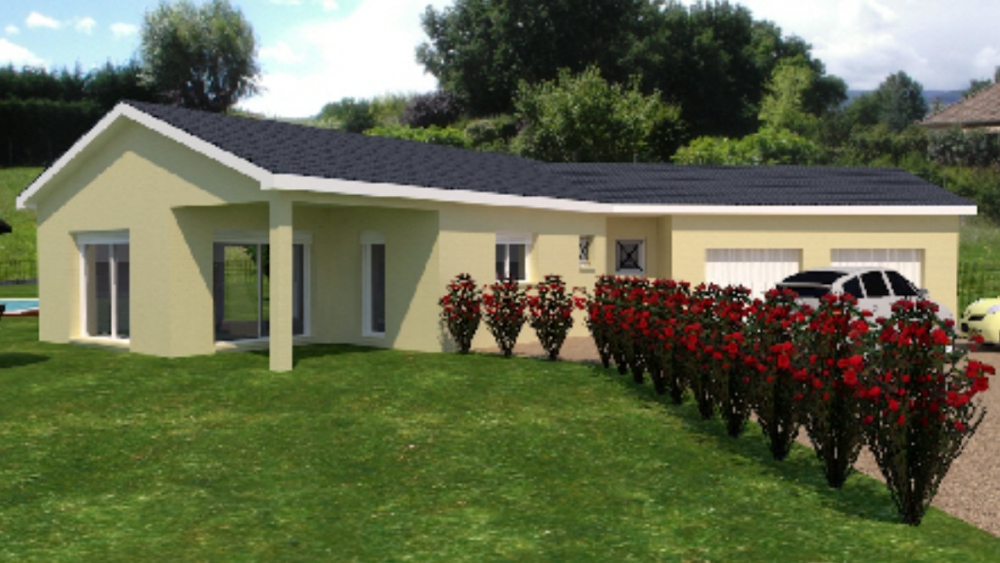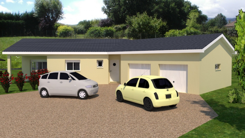 Maison de plain pied avec 3 chambres et un dressing, une cuisine indépendante, un grand séjour, 2 WC, un cellier, un grand garage, une terrasse et un porche.