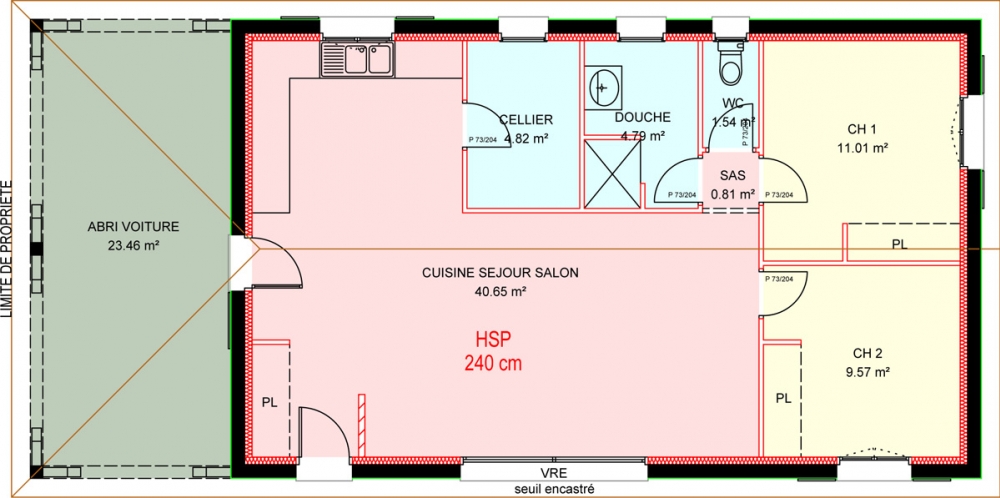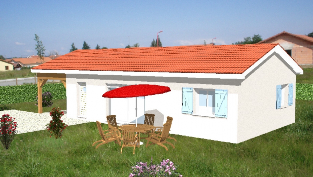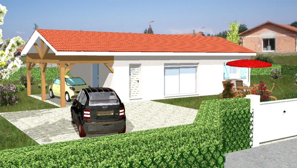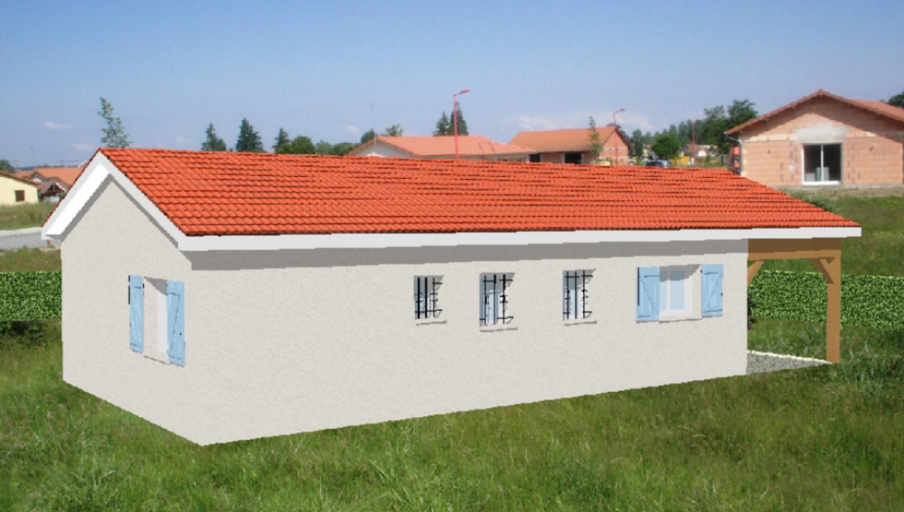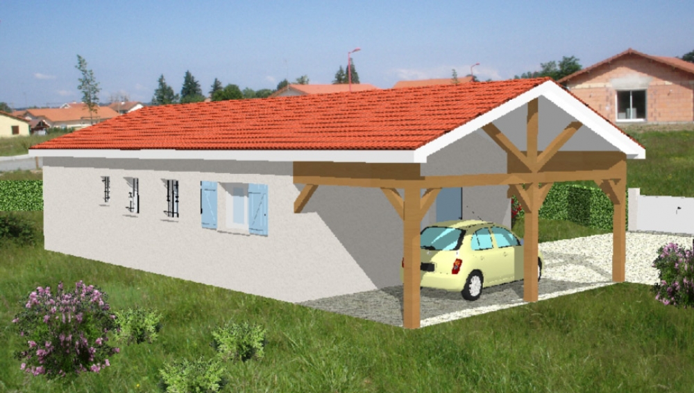Maison de plain pied avec 2 chambres, une cuisine ouverte sur un grand séjour, un cellier et un abri voiture.