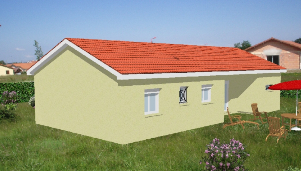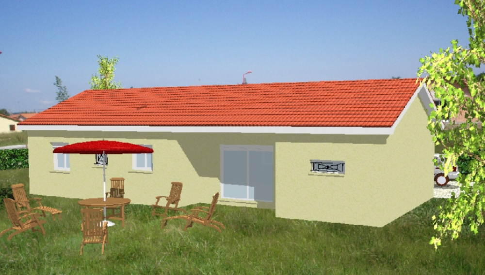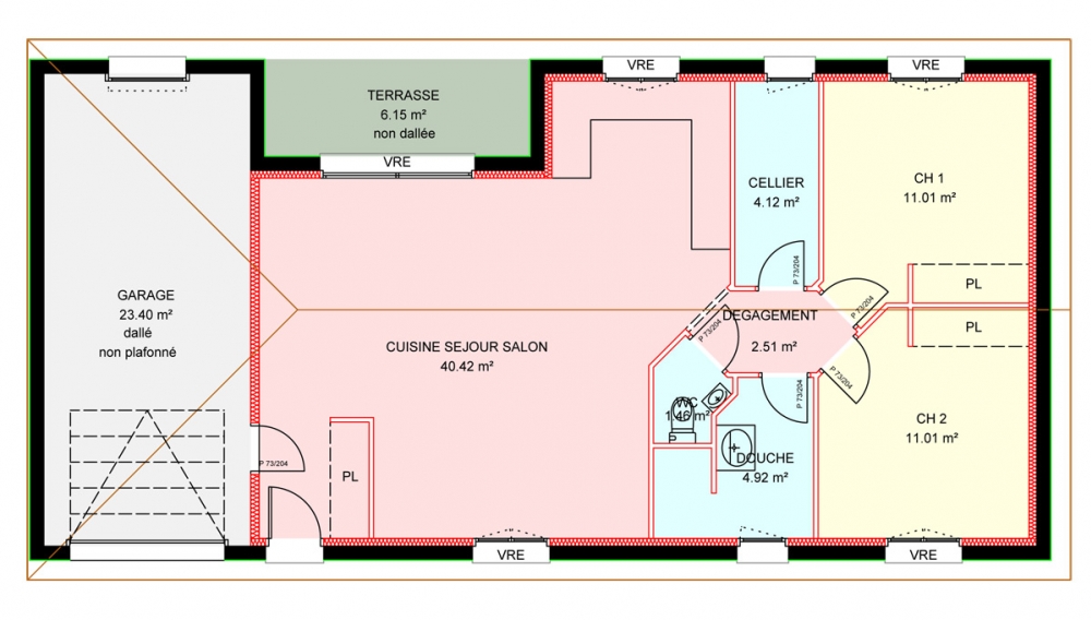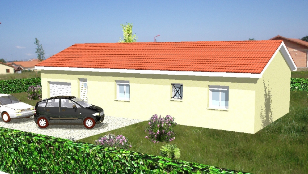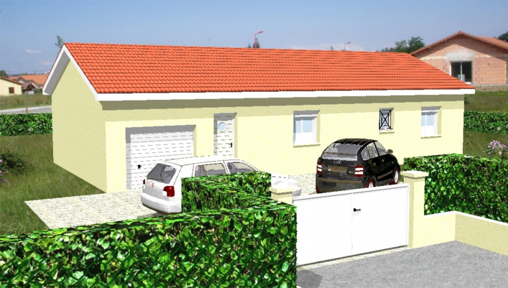 Maison de plain pied avec 2 chambres, un cellier, une cuisine ouverte sur un grand séjour, une terrasse et un garage.