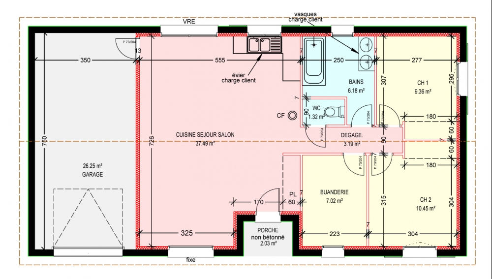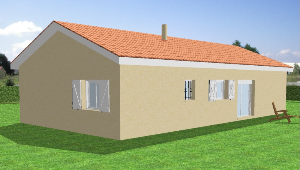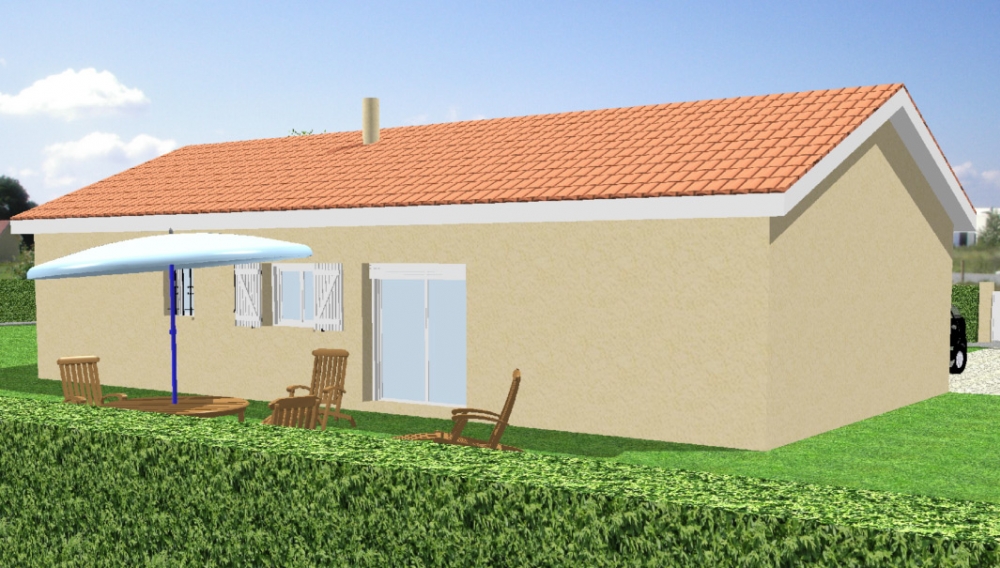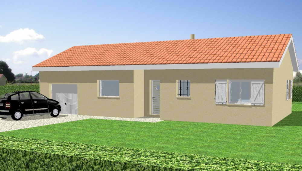 Maison de plain pied avec 2 chambres, une buanderie, une cuisine ouverte sur un séjour, un porche et un garage.