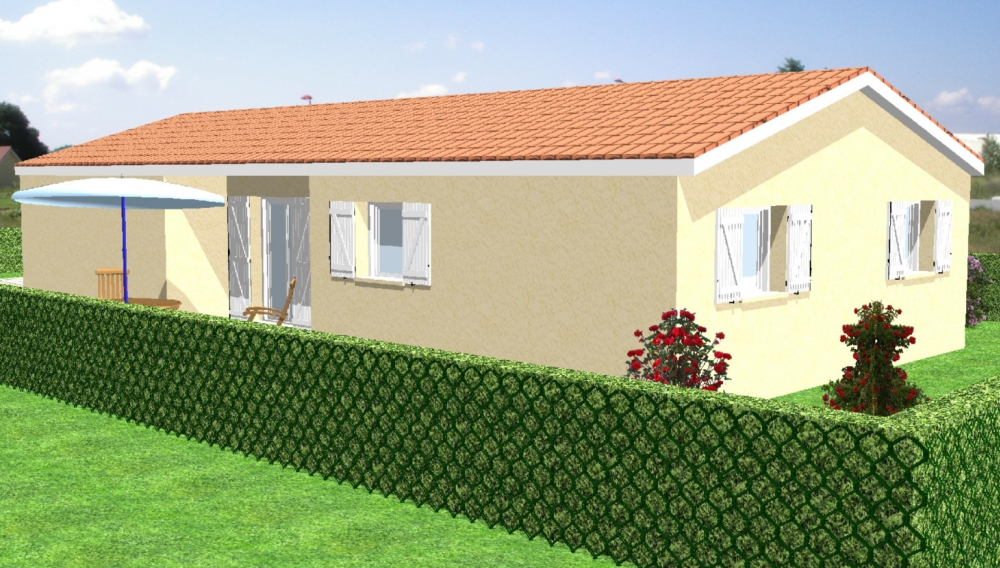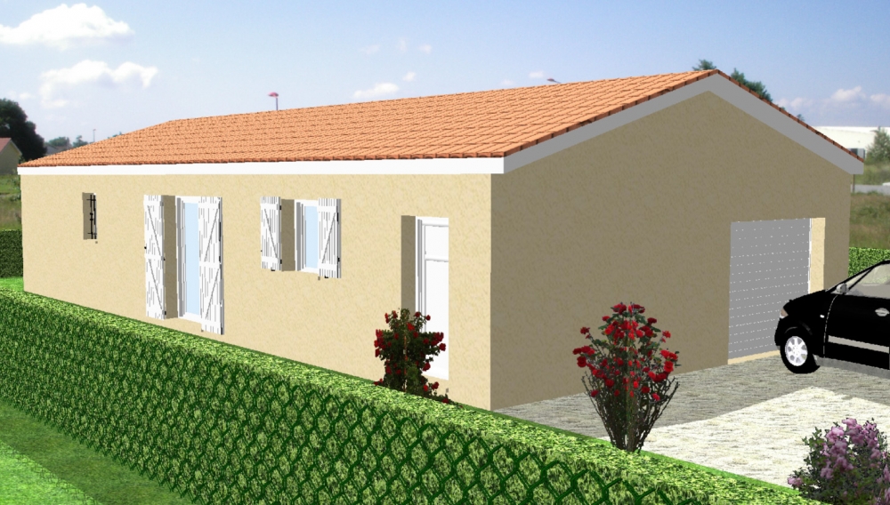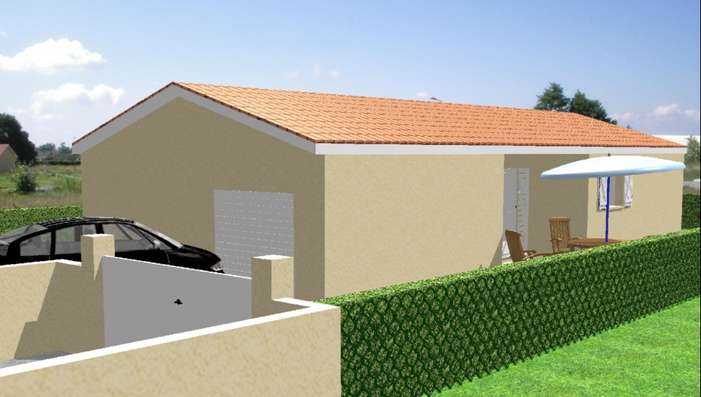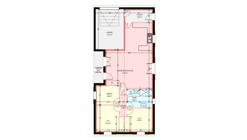 Maison de plain pied avec 2 chambres et un bureau, une cuisine ouverte sur un séjour, un cellier, une terrasse et un garage.