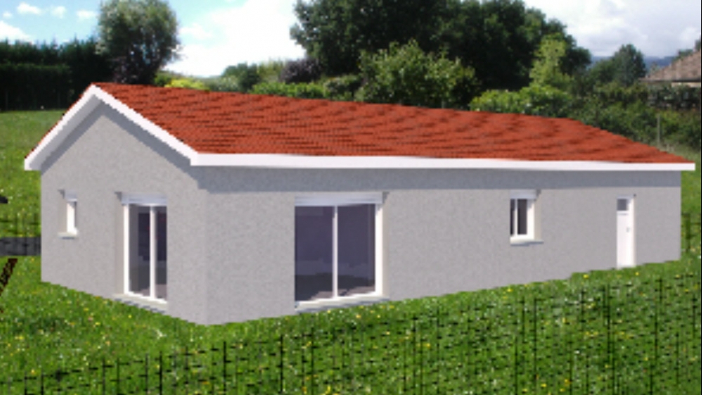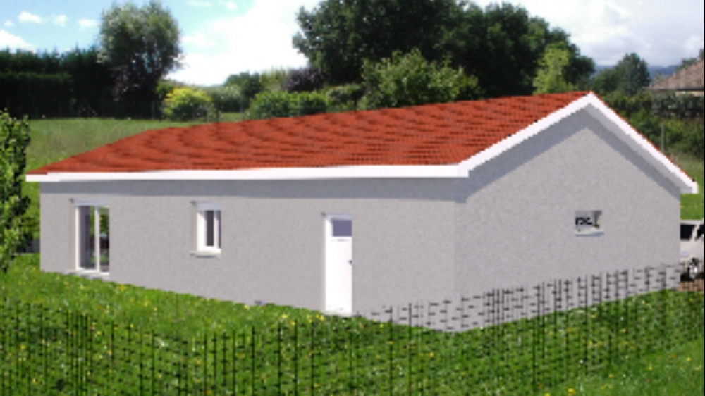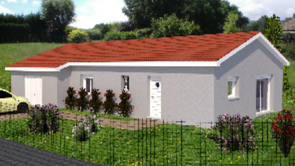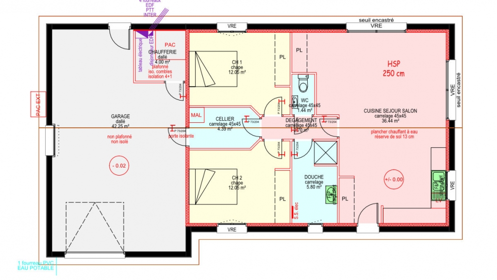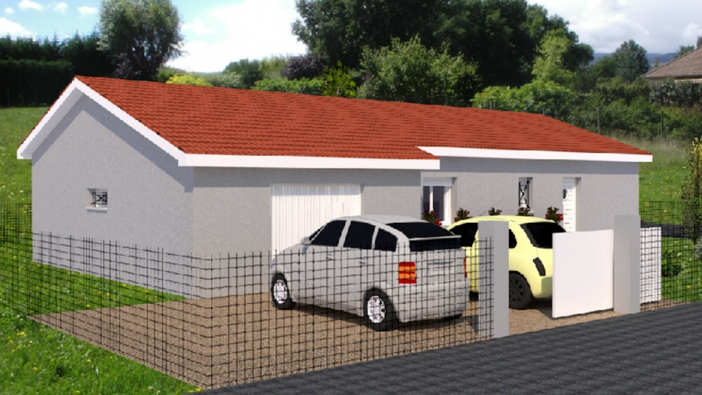 Maison de plain pied avec 2 chambres, une cuisine ouverte sur un séjour, un cellier, une chaufferie et un grand garage.