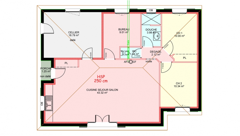 Maison de plain pied avec 2 chambres, un bureau, un grand cellier, une cuisine ouverte sur un grand séjour et un porche.