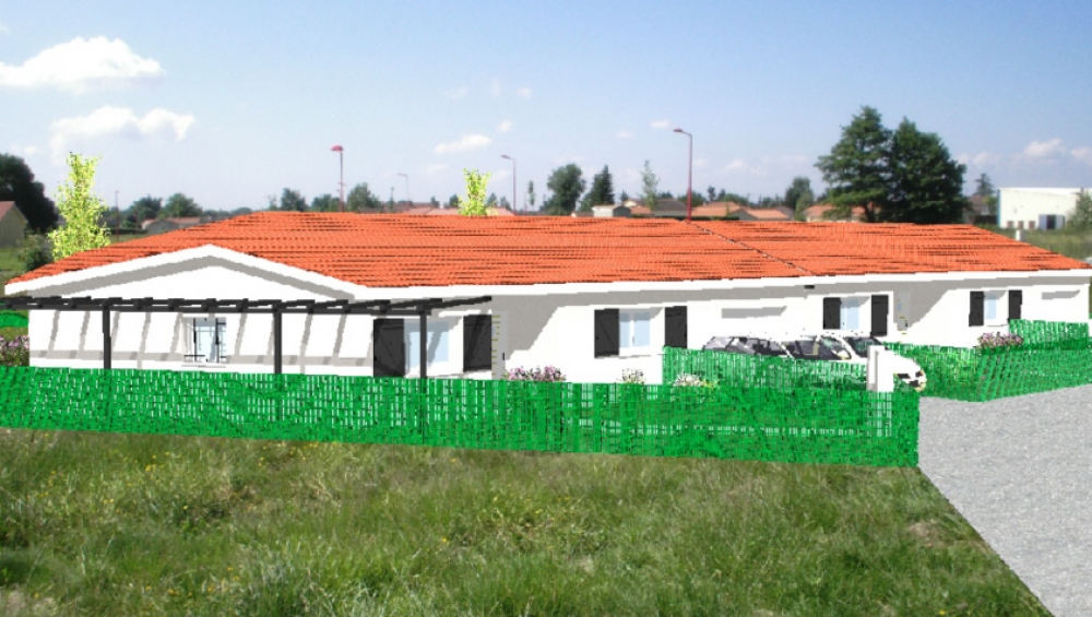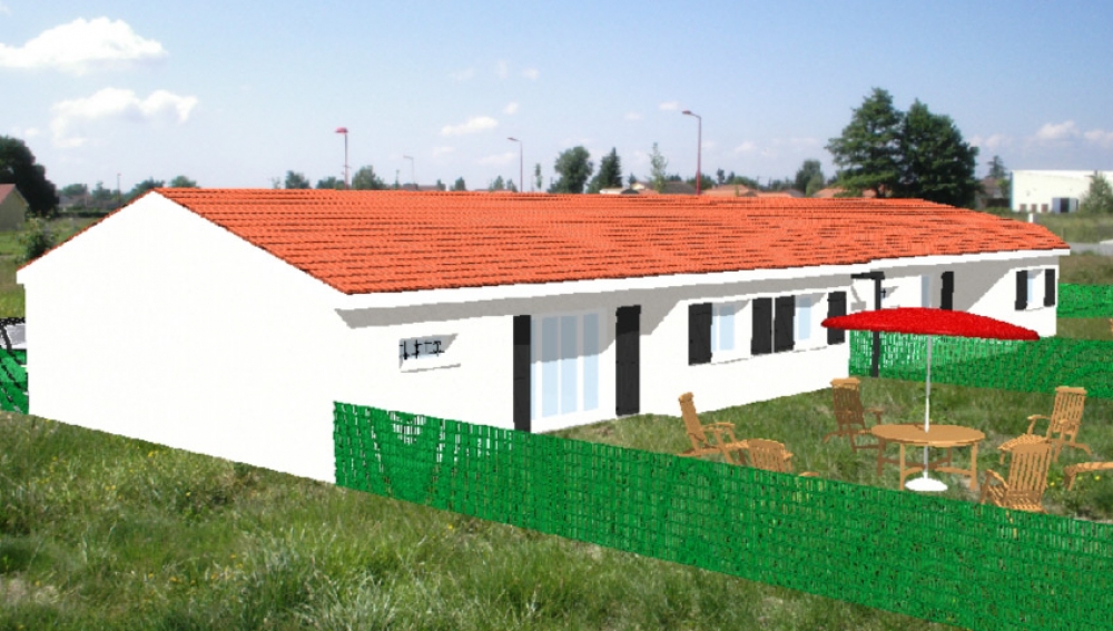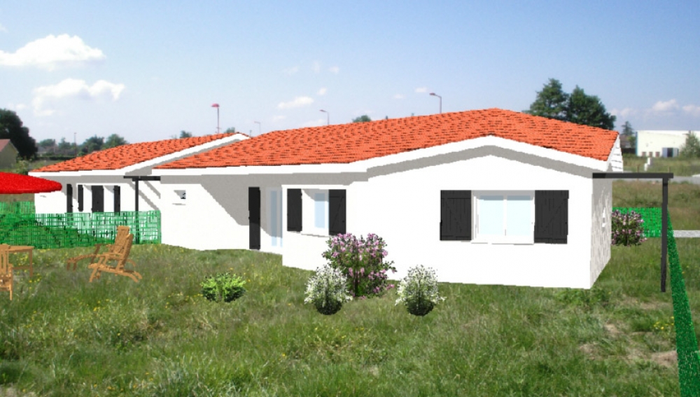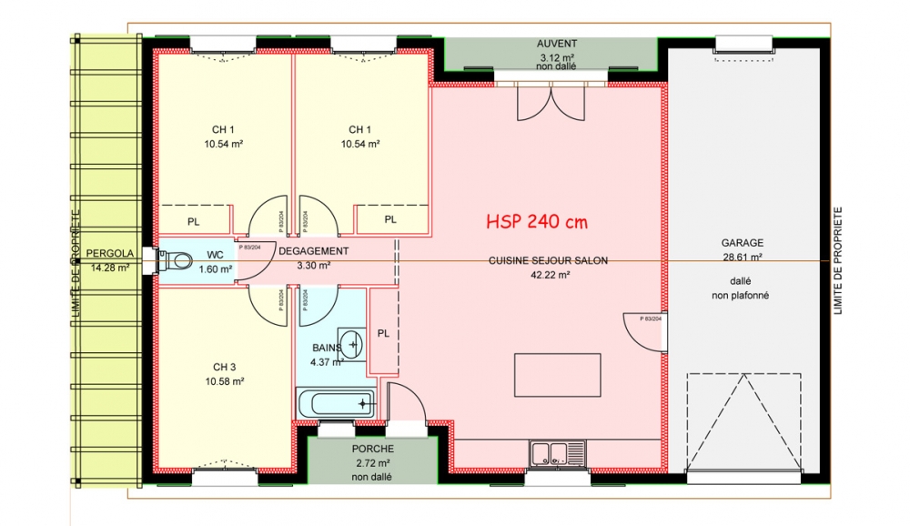 Maison de plain pied avec 3 chambres, une cuisine ouverte sur un grand séjour, un porche, une terrasse, un garage et une pergola.