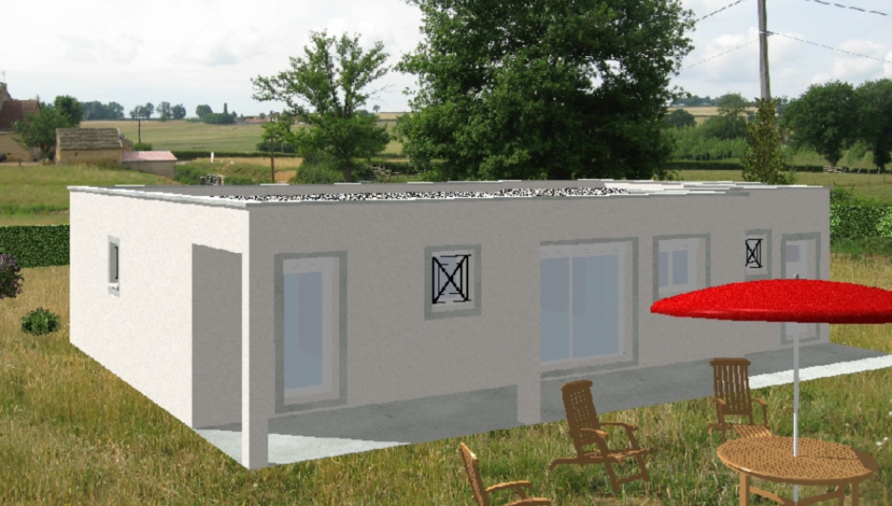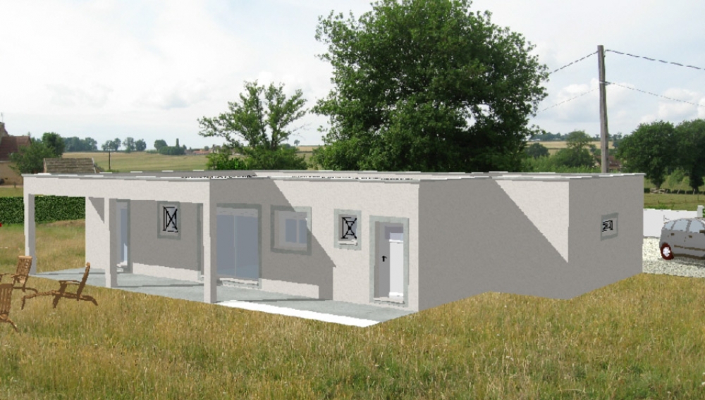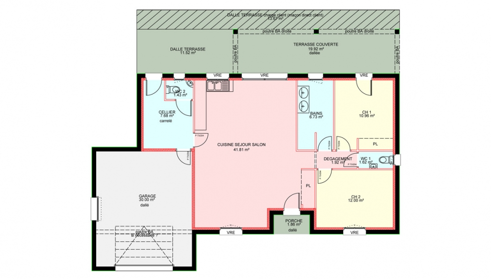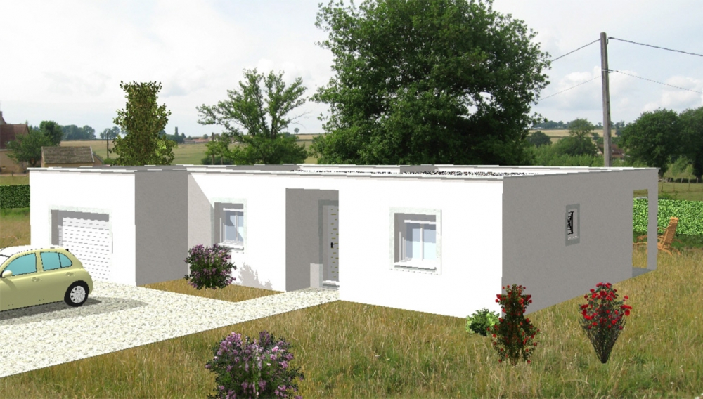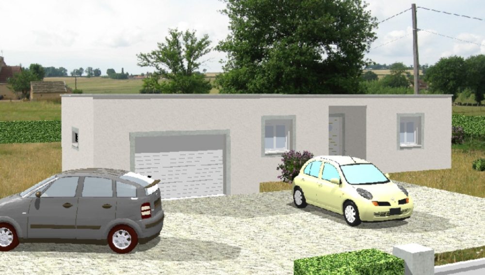 Maison de plain pied avec 2 chambres, une cuisine ouverte sur un grand séjour, un cellier, un porche, un garage et une terrasse.