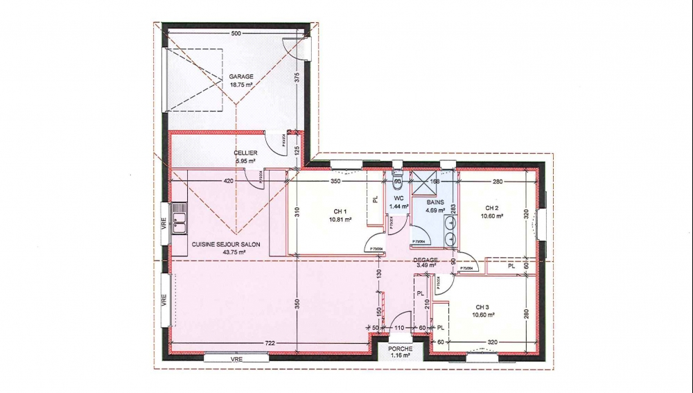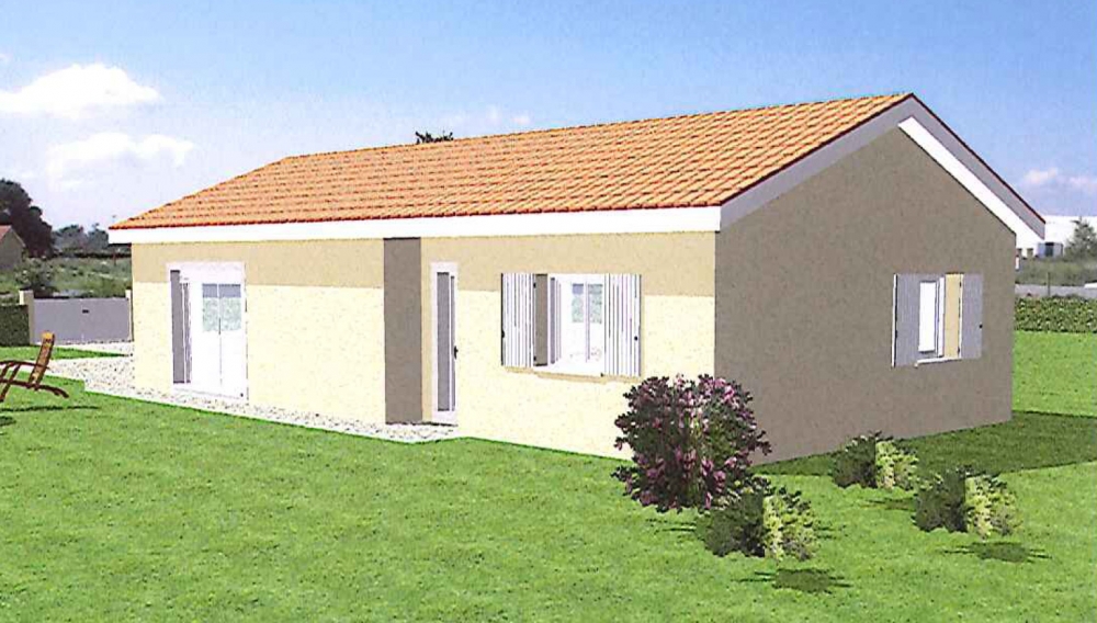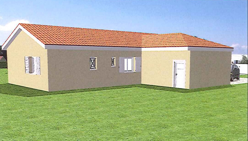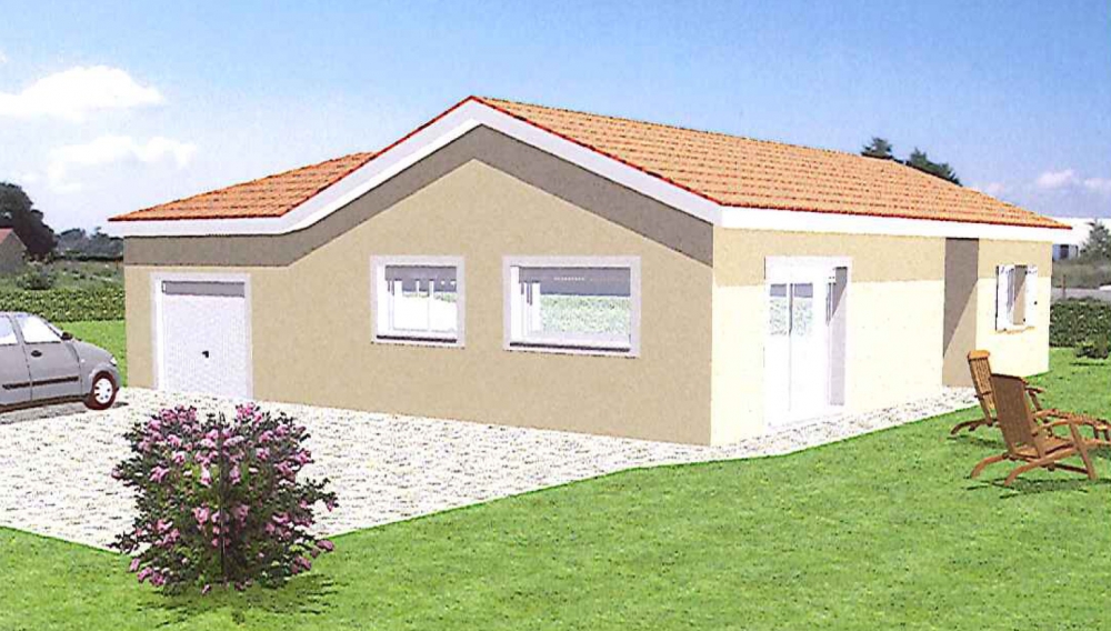 Maison de plain pied avec 3 chambres, une cuisine ouverte sur un grand séjour, un cellier et un garage.