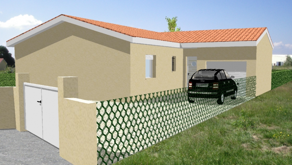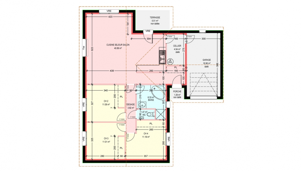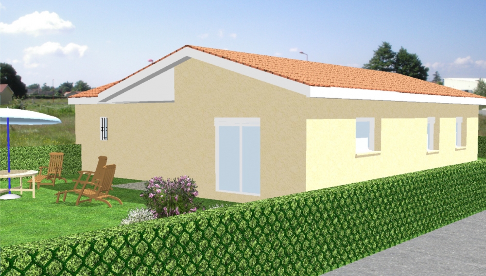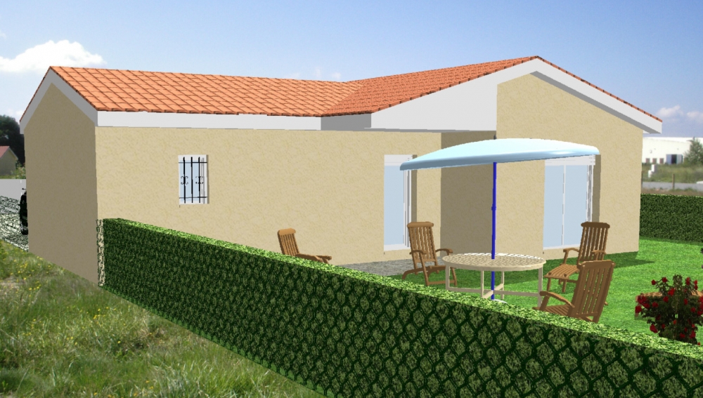 Maison de plain pied avec 3 chambres, une cuisine ouverte sur un grand séjour, un cellier, un porche, une terrasse et un garage.