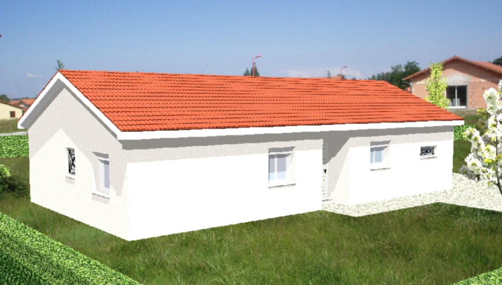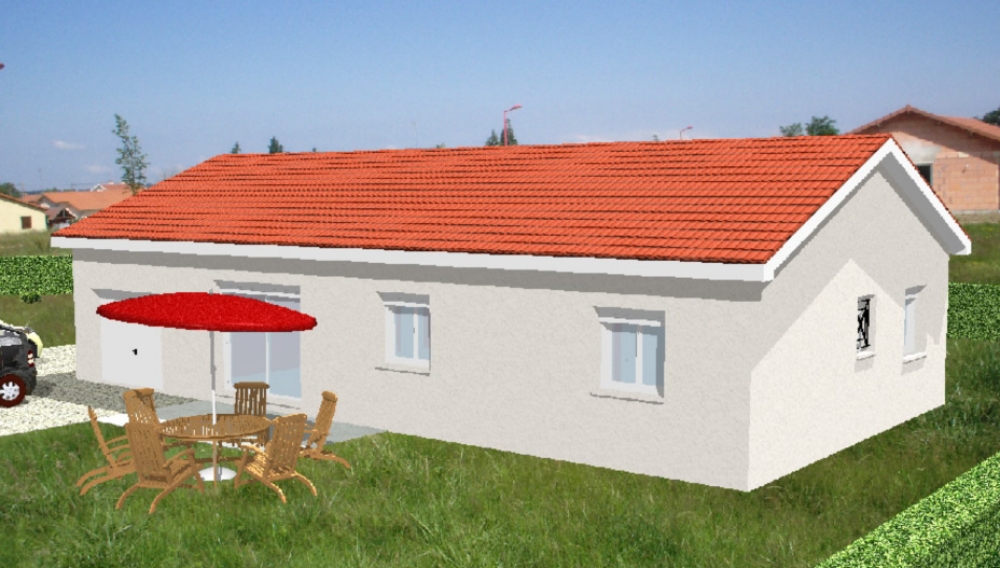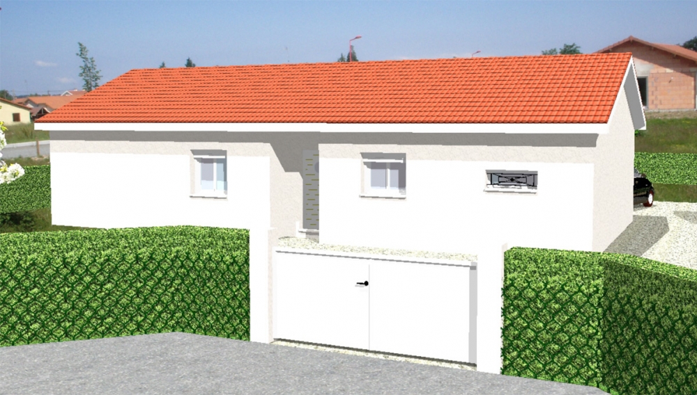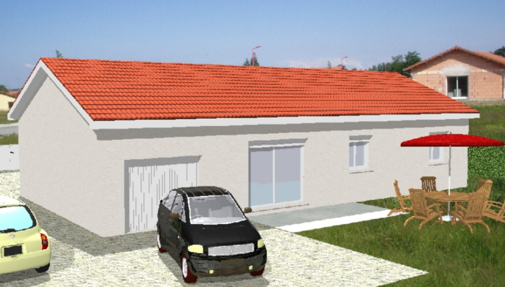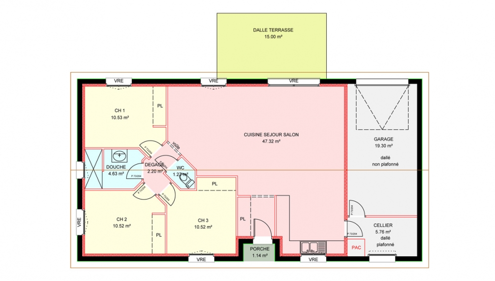 Maison de plain pied avec 3 chambres, une cuisine ouverte sur un grand séjour, un cellier, un porche, une terrasse et un garage.