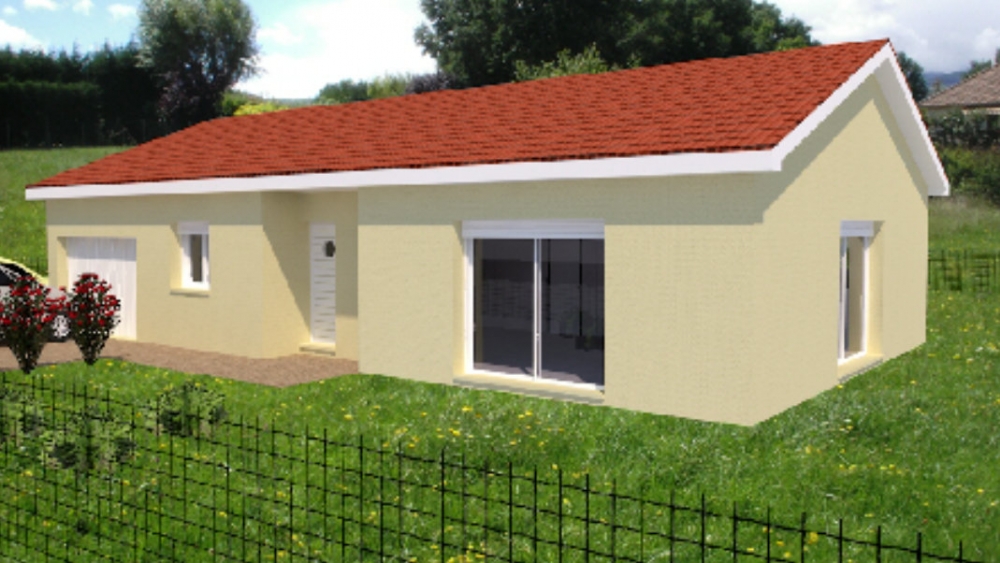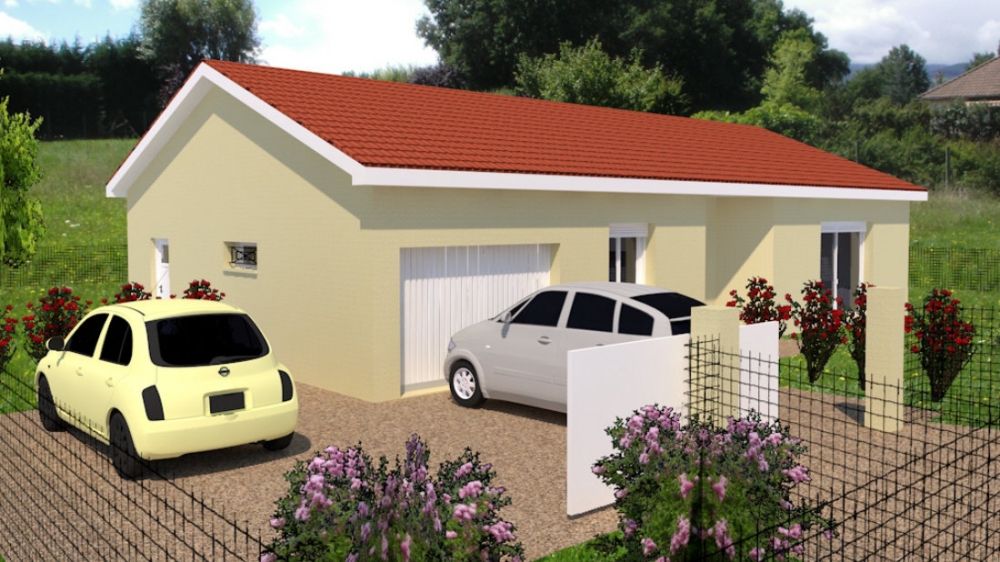 Maison de plain pied avec 2 chambres et un bureau, une cuisine ouverte sur un grand séjour, un cellier, un garage et un porche.