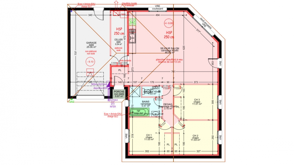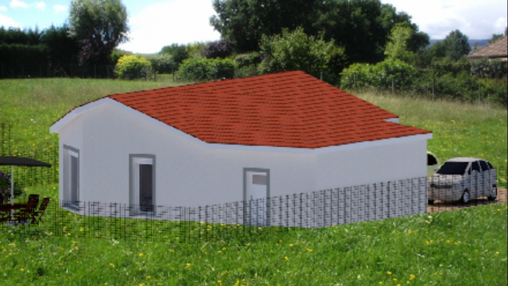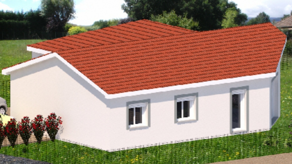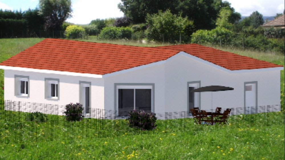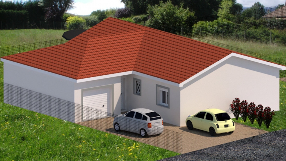 Maison de plain pied avec 3 chambres, une cuisine ouverte sur un grand séjour, un cellier, un garage double et un porche.