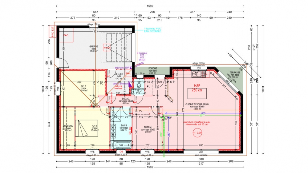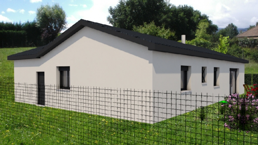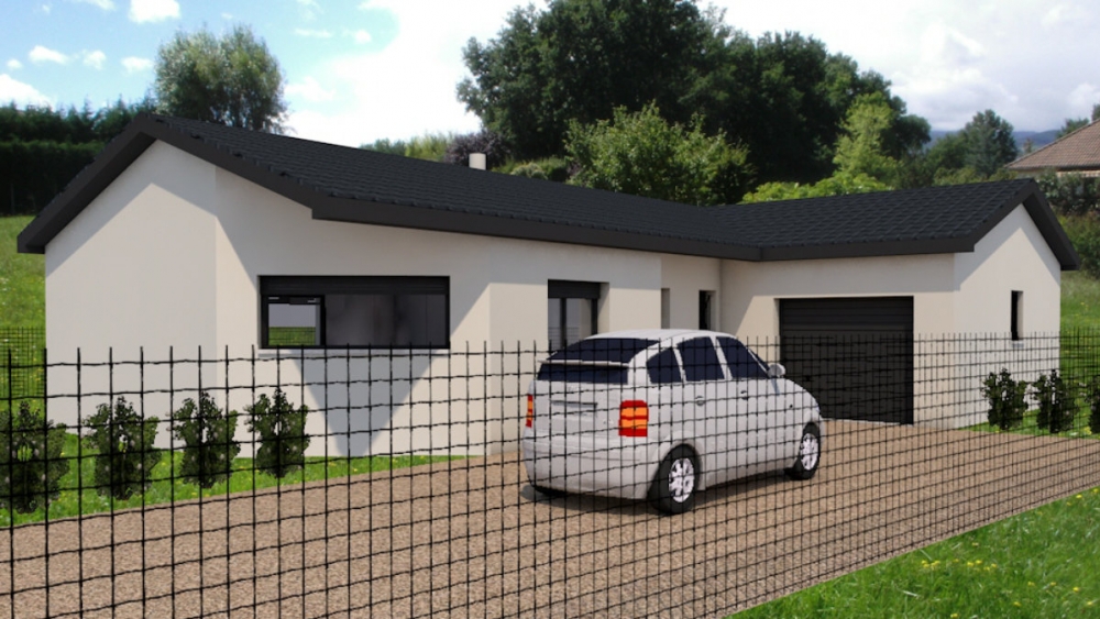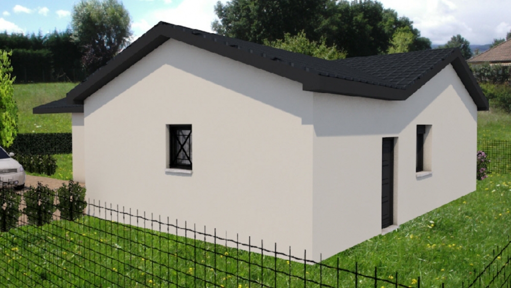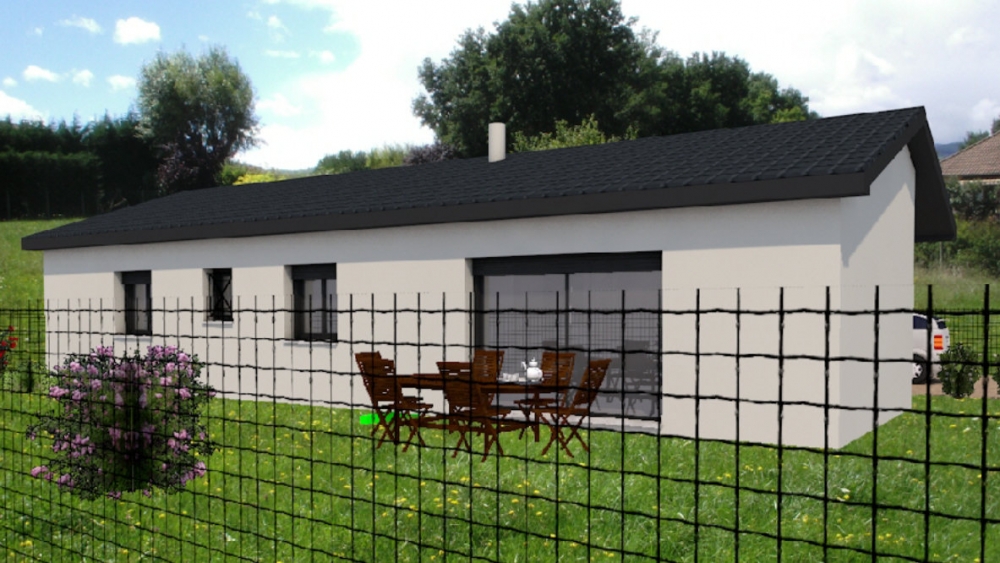 Maison de plain pied avec 2 chambres et 1 bureau, une cuisine ouverte sur un grand séjour, un cellier, un garage, un porche et une petite terrasse.