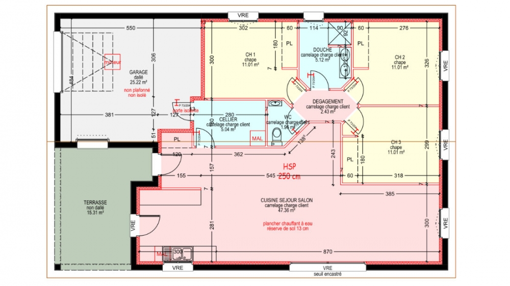 Maison de plain pied avec 3 chambres, une cuisine ouverte sur un grand séjour, un cellier, une garage et une terrasse.