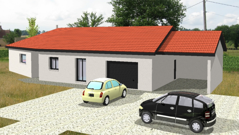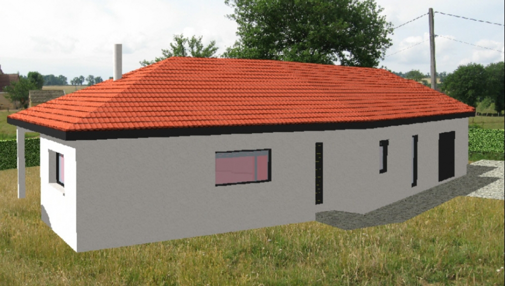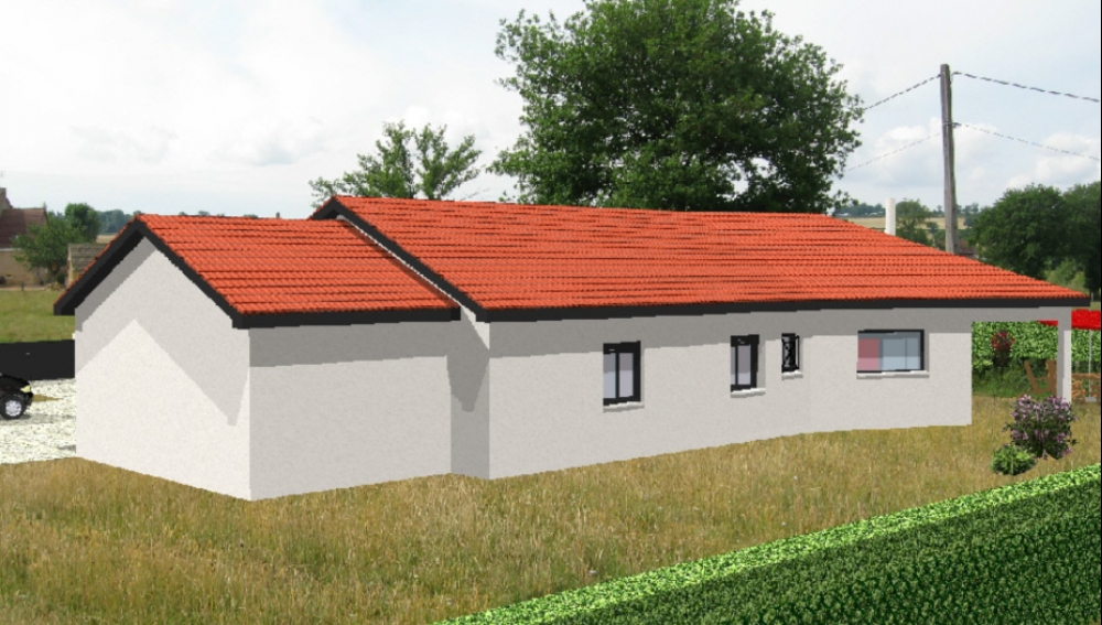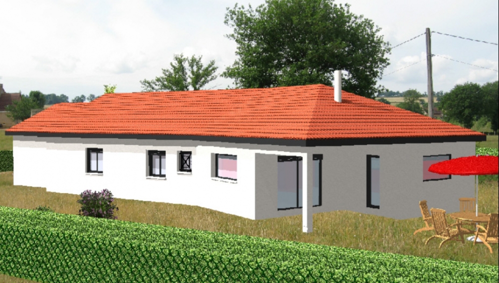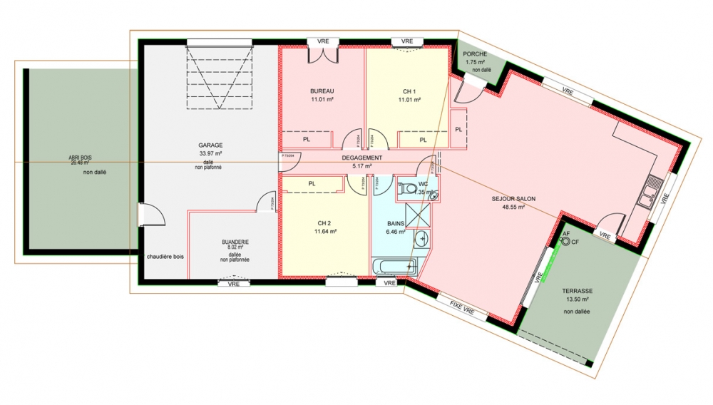 Maison de plain pied avec 2 chambres, un bureau, une cuisine ouverte sur un grand séjour, une buanderie, une terrasse, un porche, un grand garage et un abris bois.