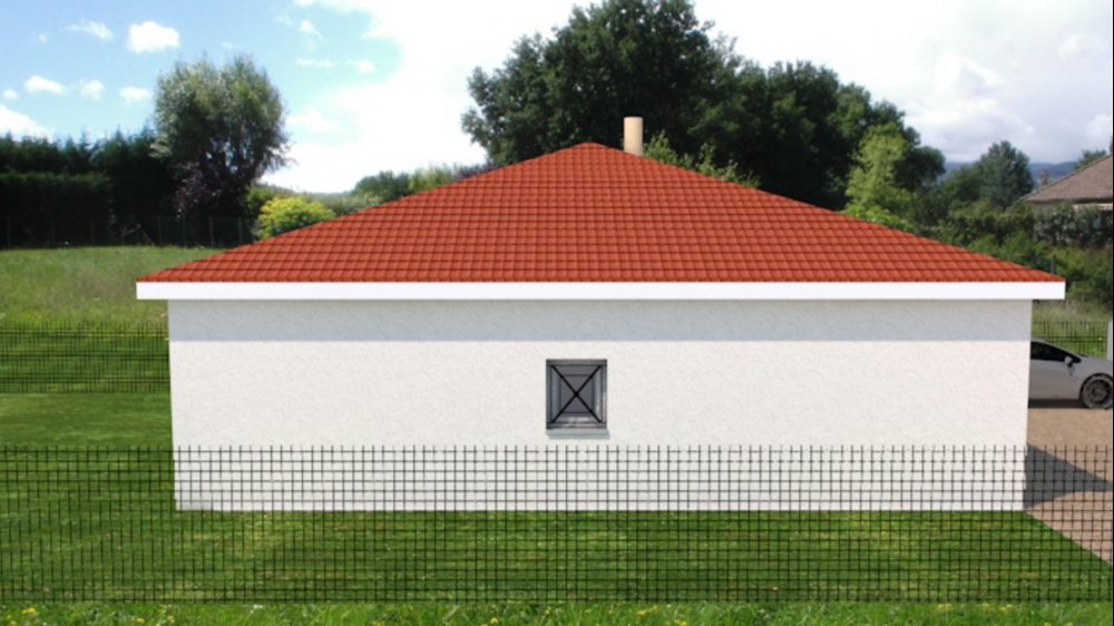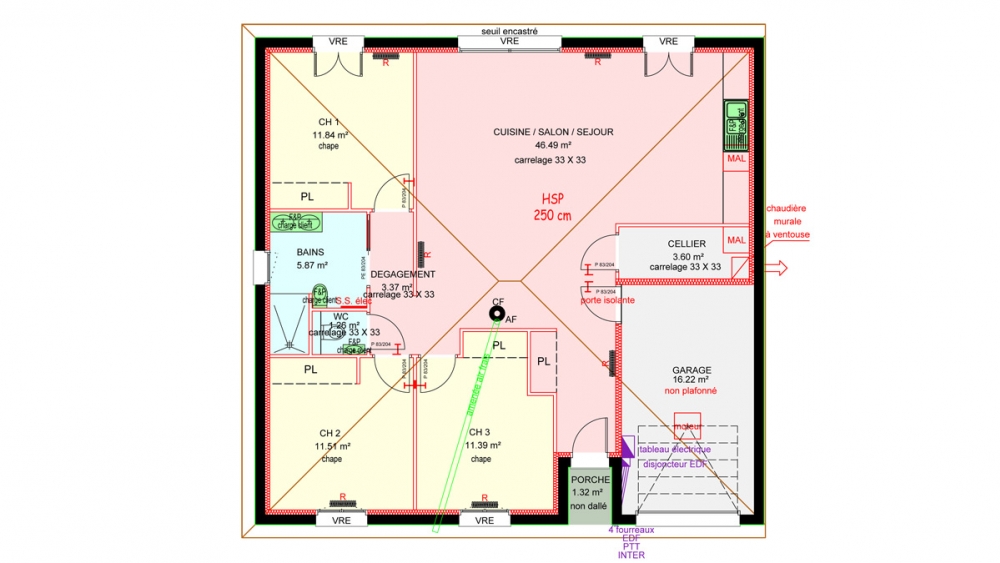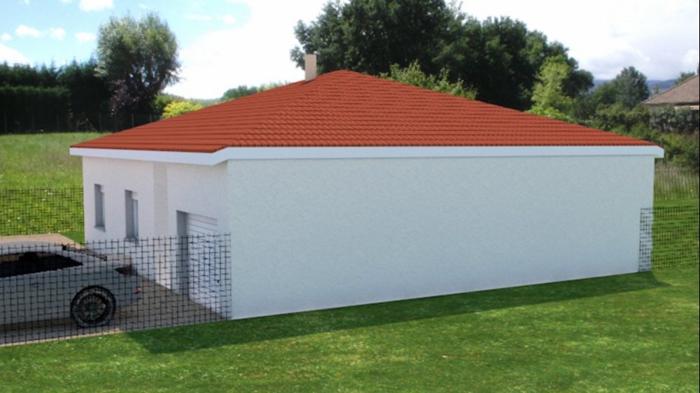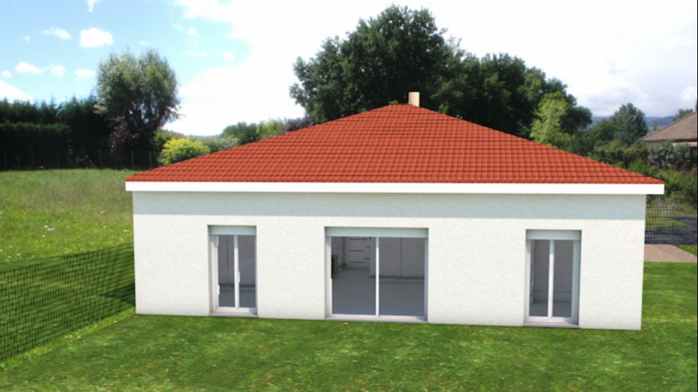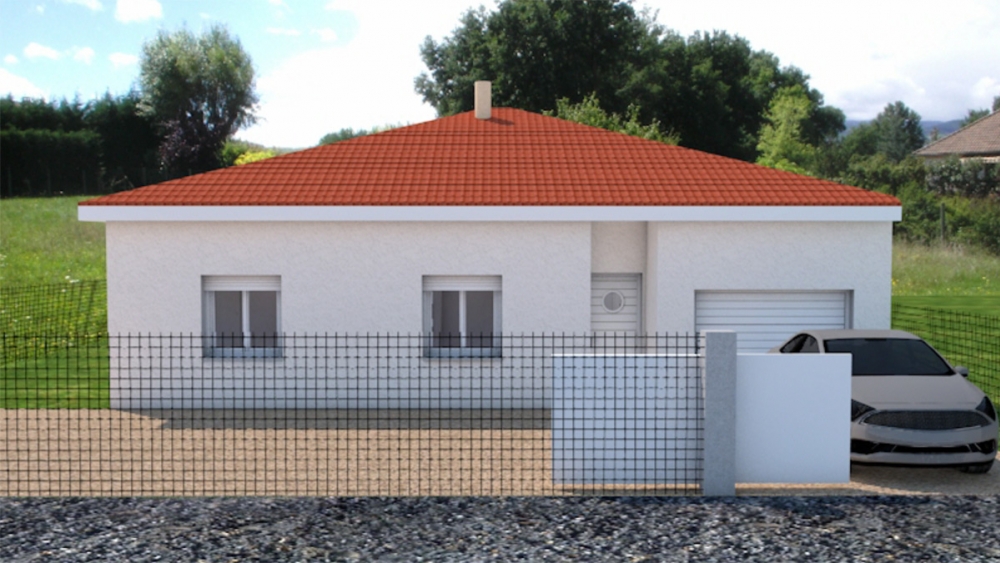 Maison de plain pied avec 3 chambres, un grand séjour avec cuisine ouverte, un cellier, un garage et un porche.