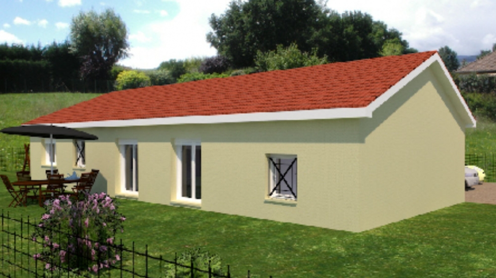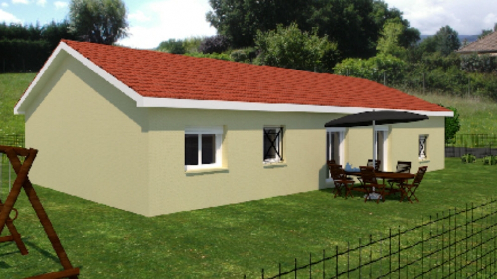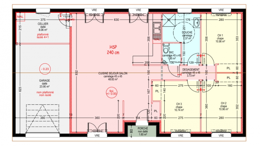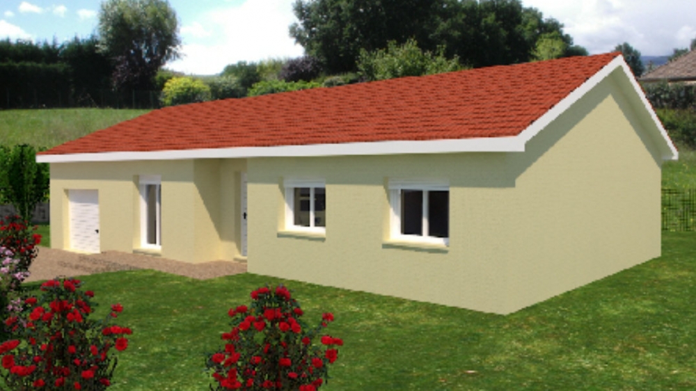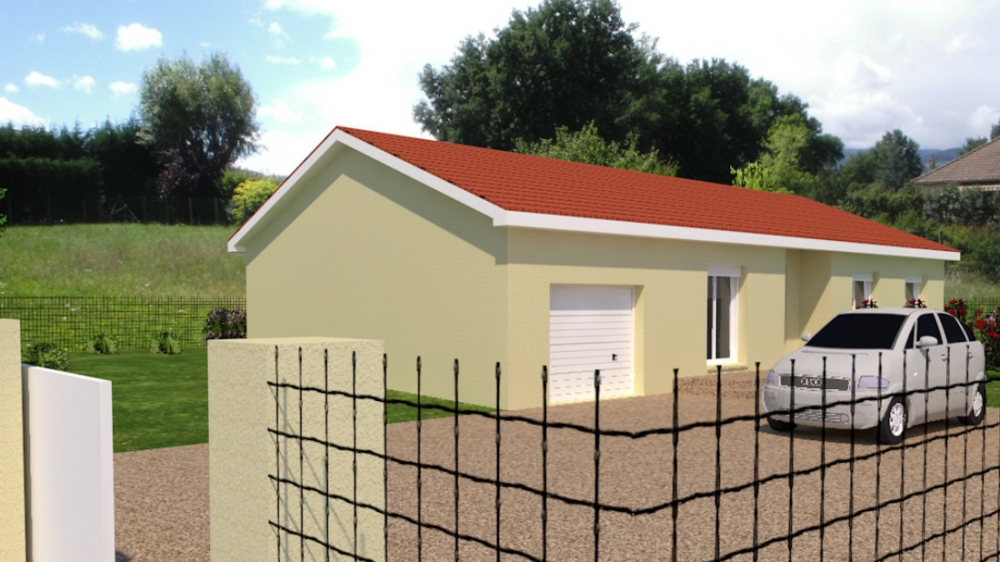 Maison de plain pied avec 3 chambres, une cuisine ouverte sur un grand séjour, un cellier, un garage et un porche.