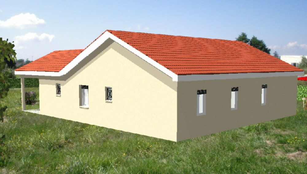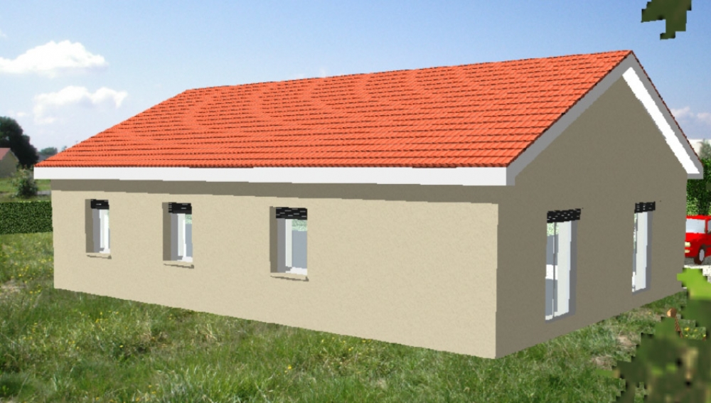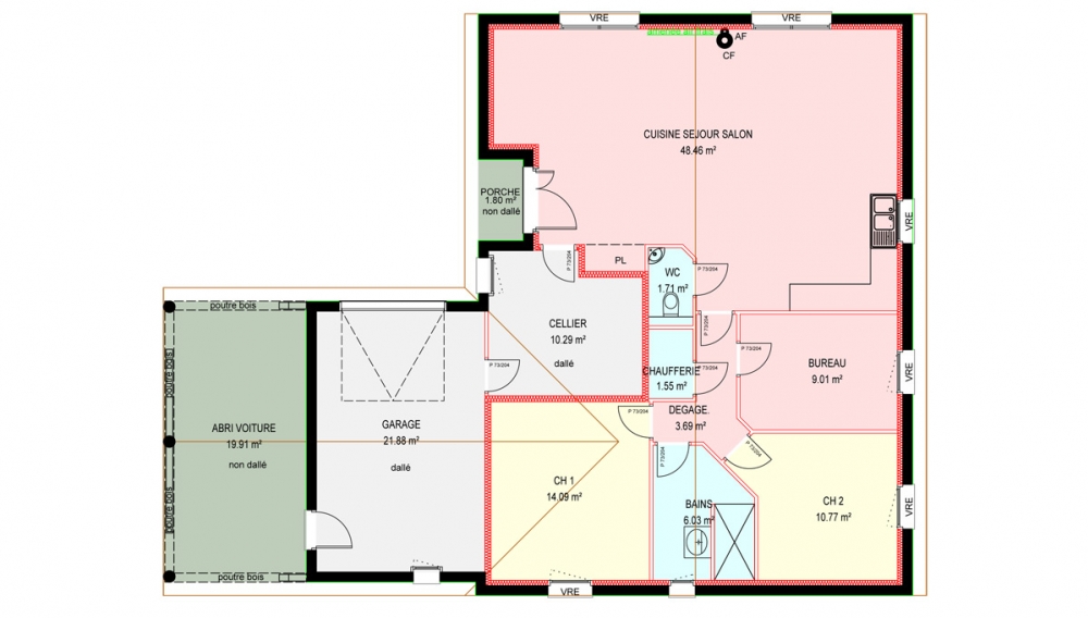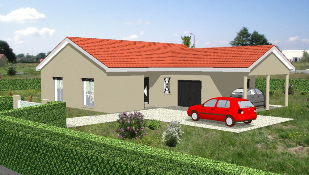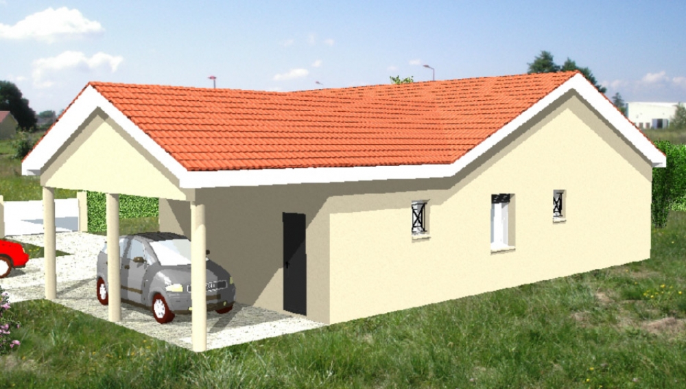 Maison de plain pied avec 2 chambres et un bureau, une cuisine ouverte sur un grand séjour, un cellier, une chaufferie, un porche, un garage et un abri voiture.