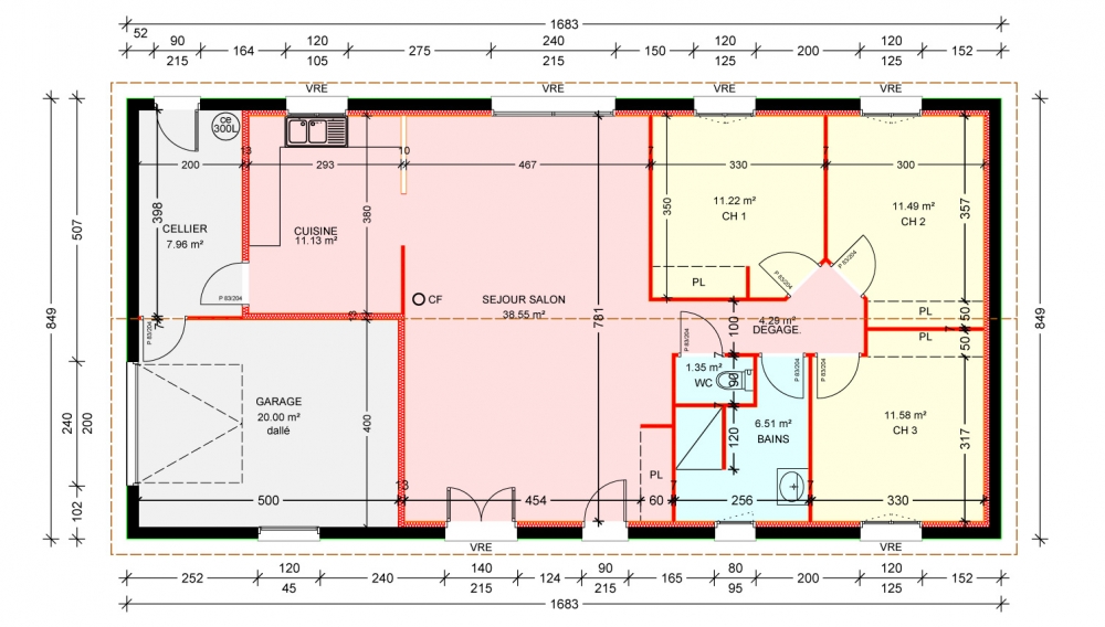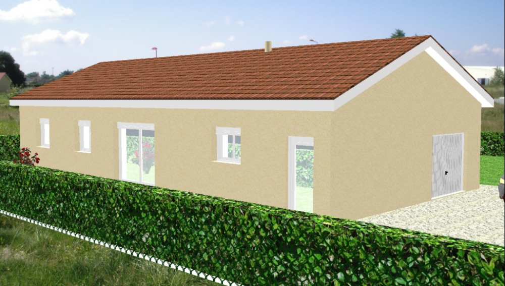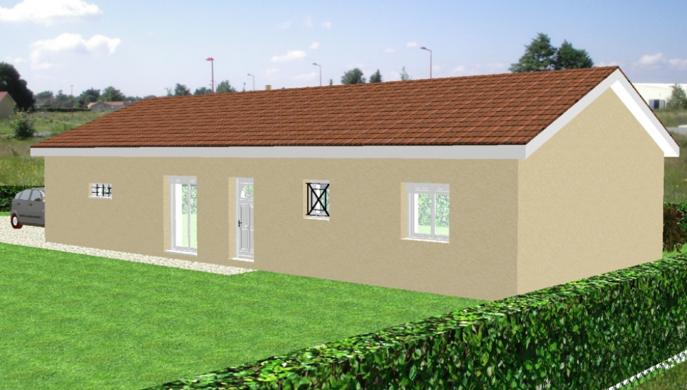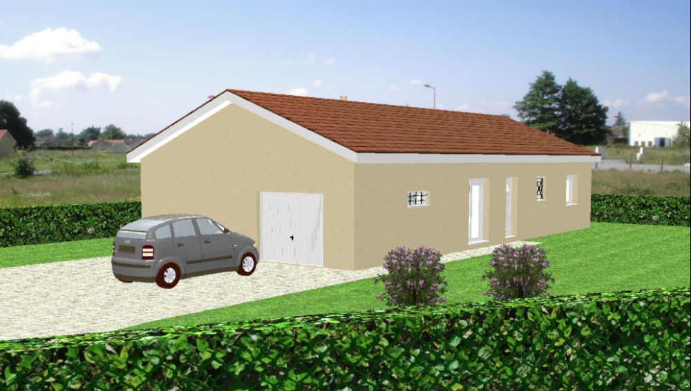 Maison de plain pied avec 3 chambres, une cuisine semi-ouverte sur un grand séjour, un cellier et un garage.