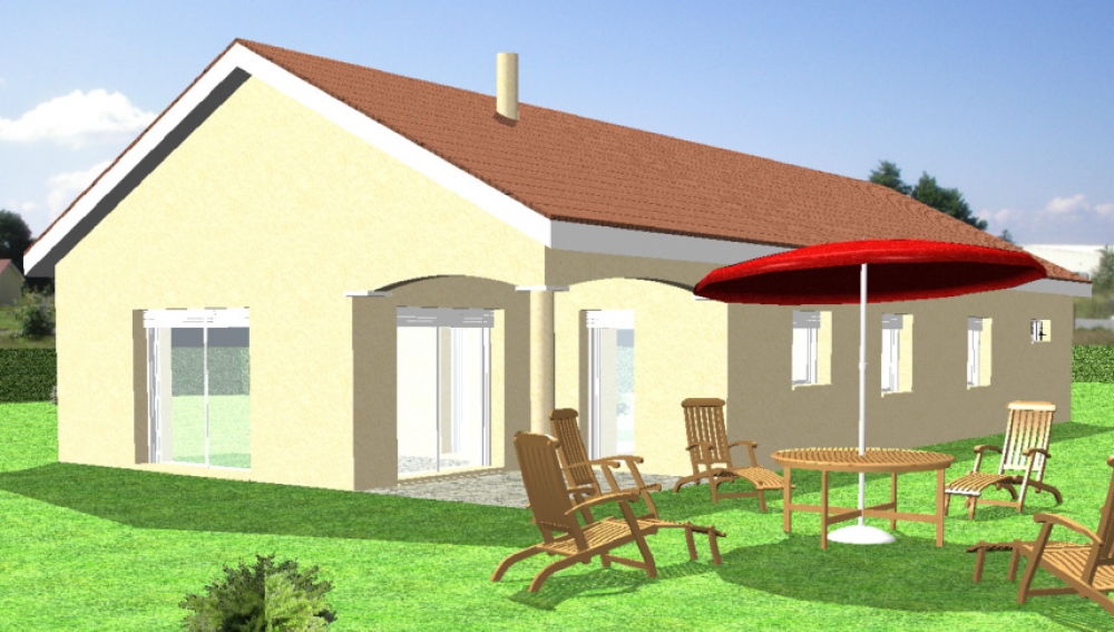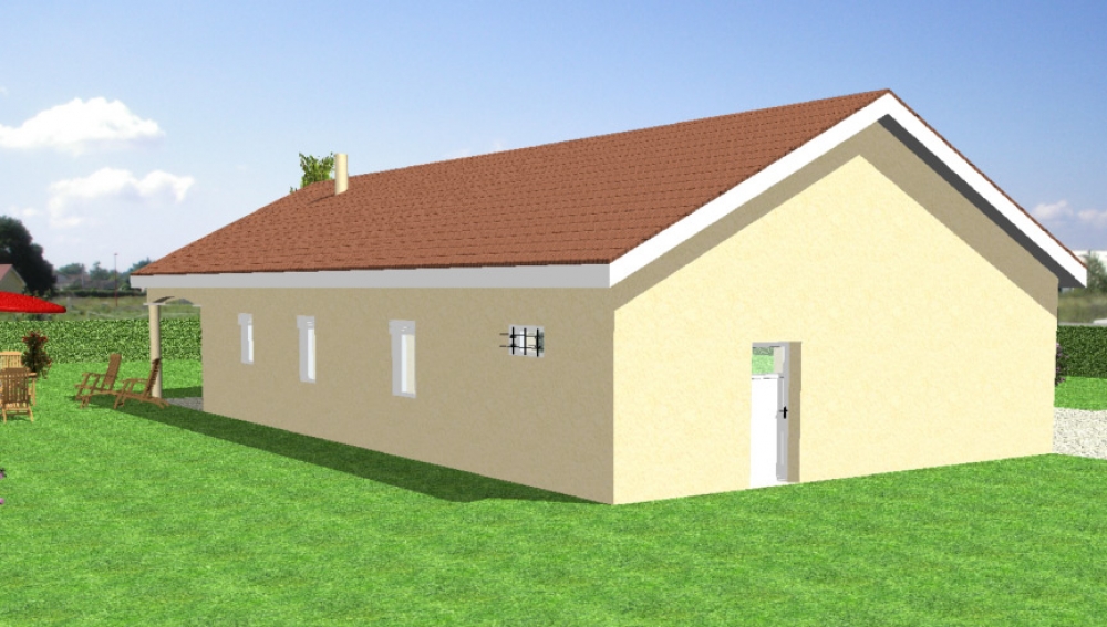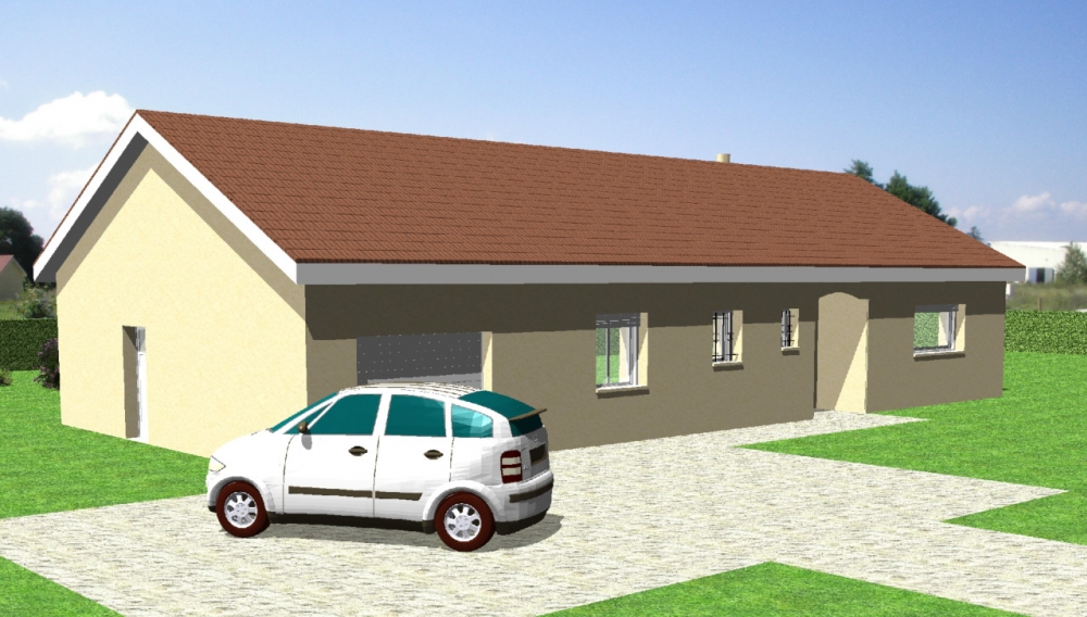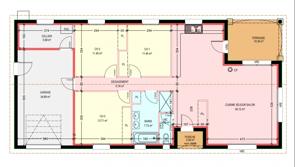 Maison de plain pied avec 4 chambres, une cuisine ouverte sur un grand séjour, un cellier, un porche, une terrasse et un garage.
