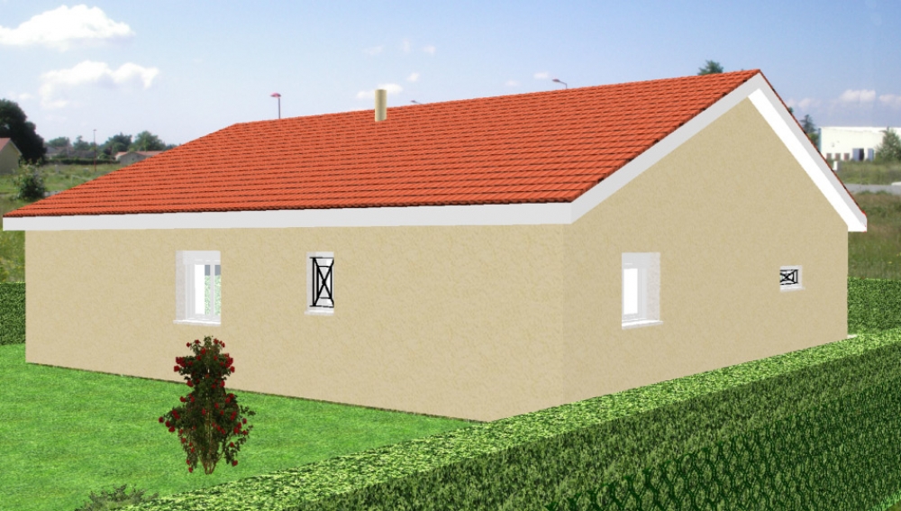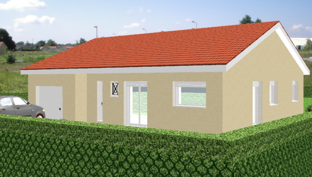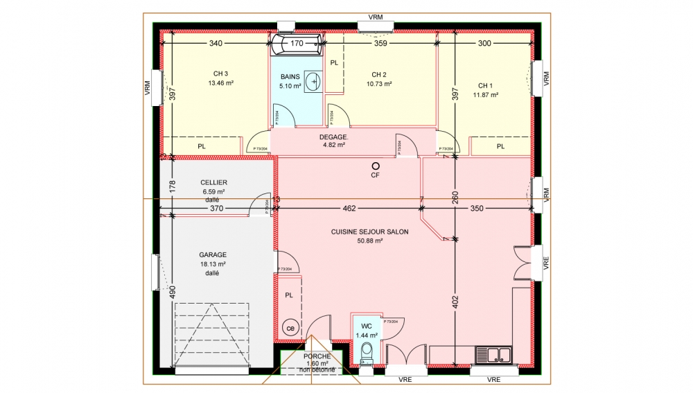 Maison de plain pied avec 3 chambres, cellier, cuisine ouverte sur grand séjour et porche.