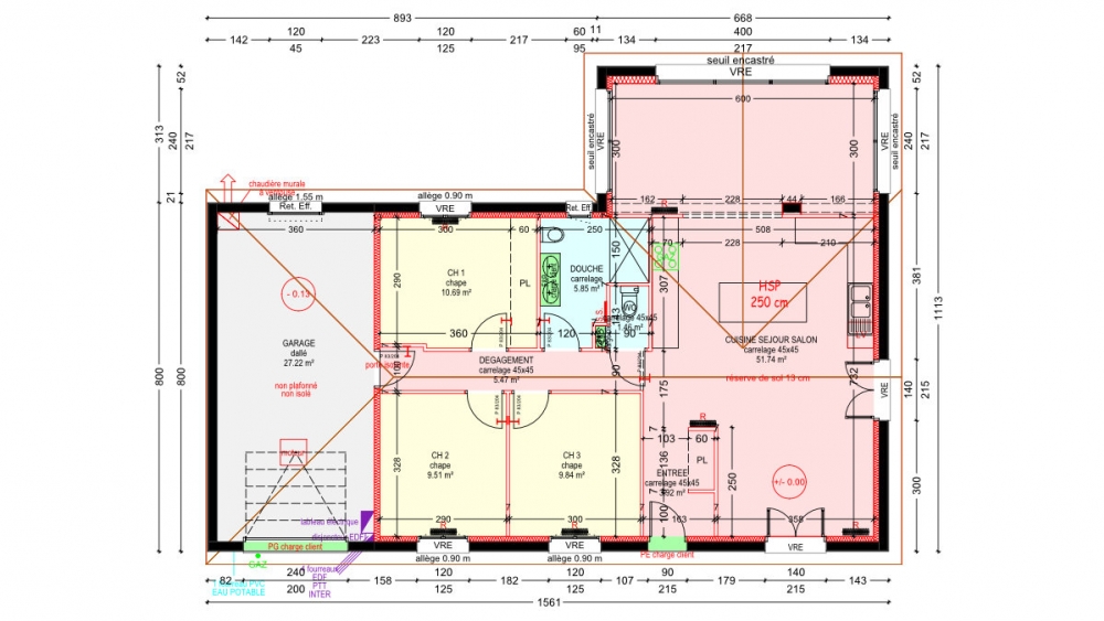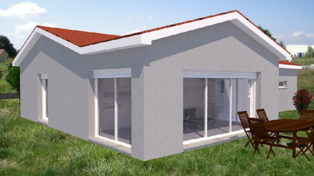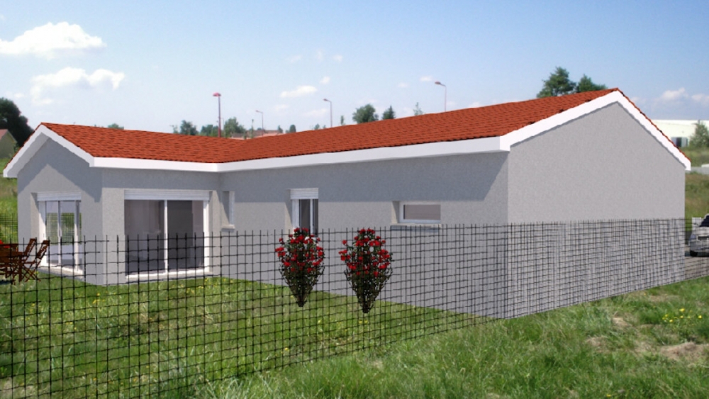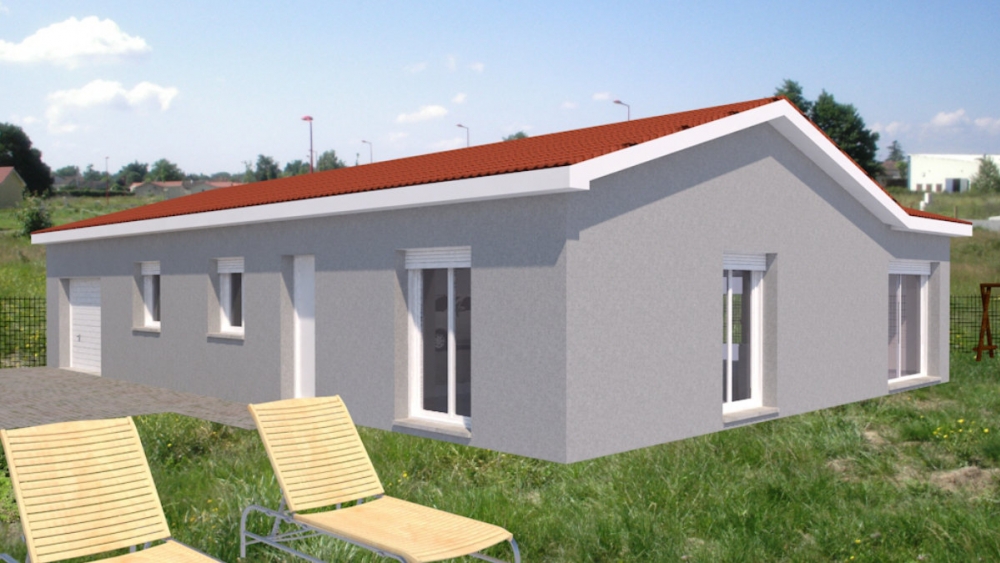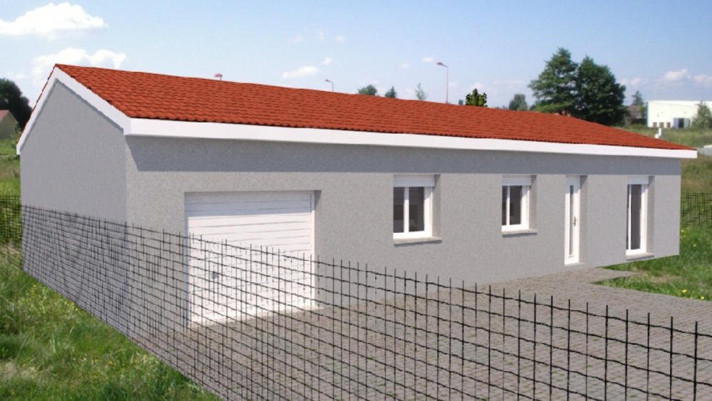Maison de plain pied avec 3 chambres, une cuisine sur un séjour double et un garage.