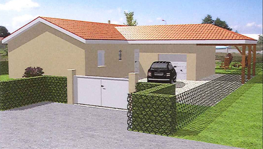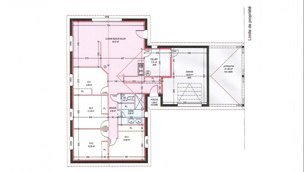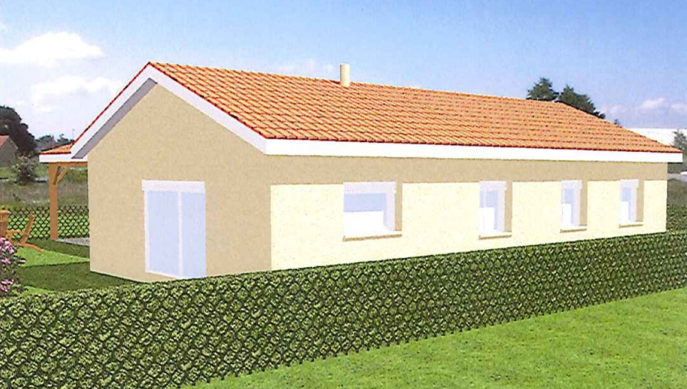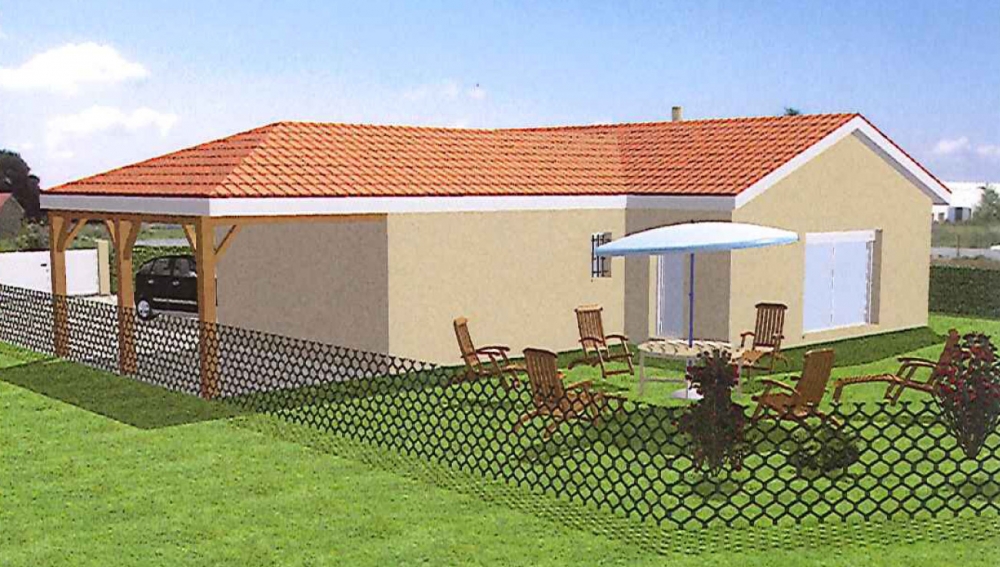 Maison de plain pied avec 4 chambres, une cuisine ouverte sur un grand séjour, un cellier, un porche, un garage et un appentis.