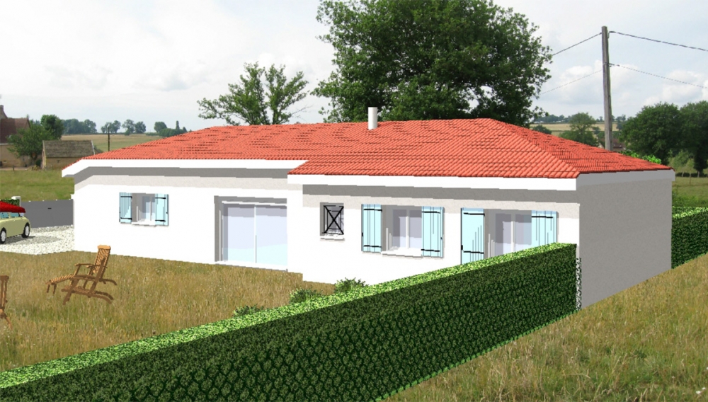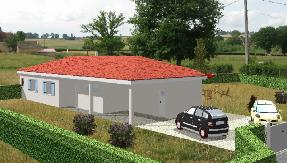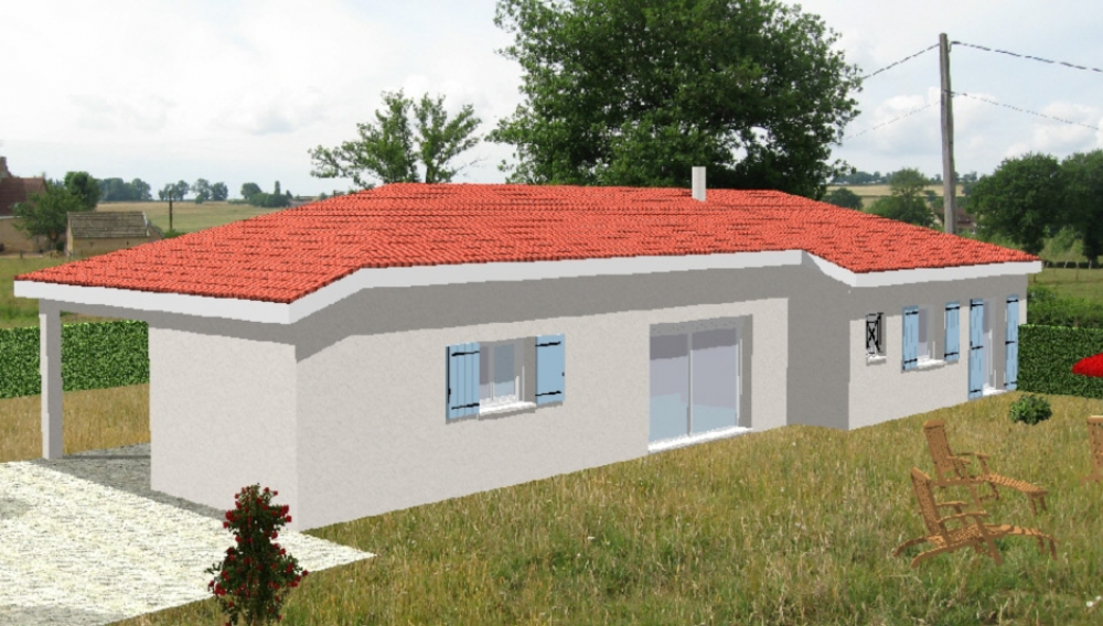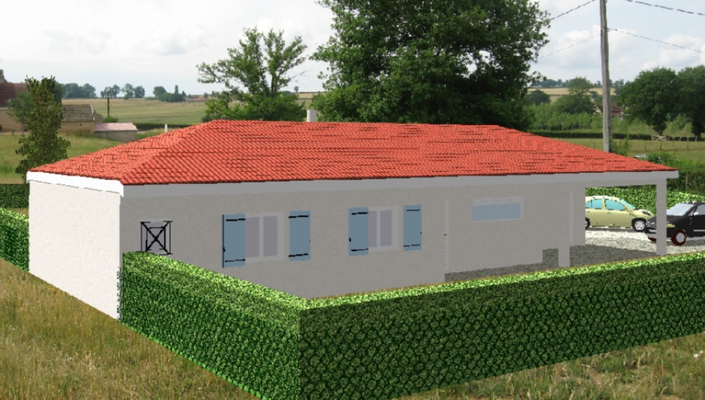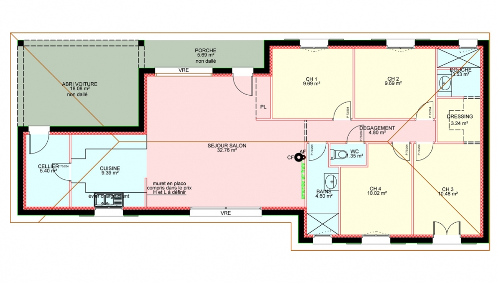 Maison de plain pied avec 4 chambres, un dressing, 2 salles de bain, une cuisine ouverte sur le séjour, un cellier, un porche et un abris pour voiture.