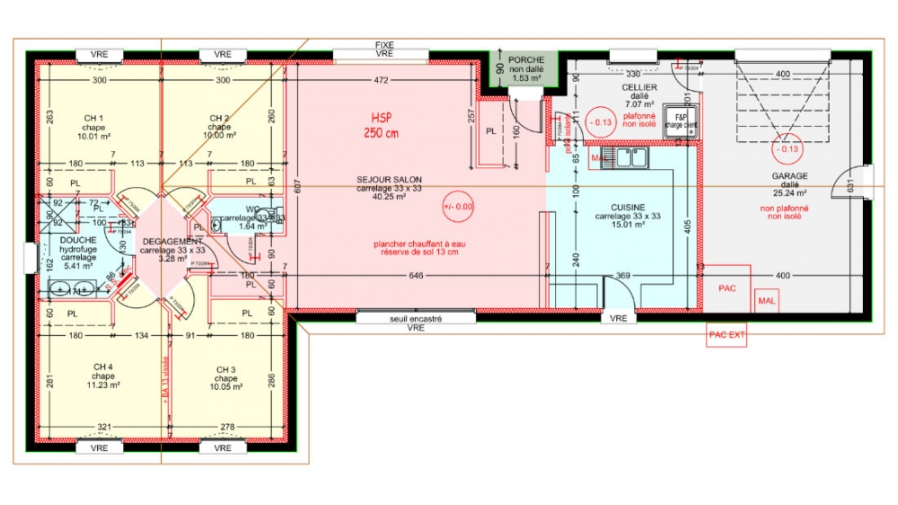 Maison de plain pied avec 4 chambres, une cuisine indépendante, un grand séjour, un cellier, un garage et un porche.