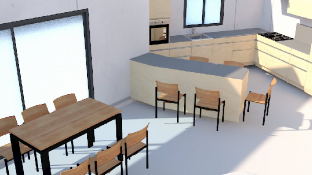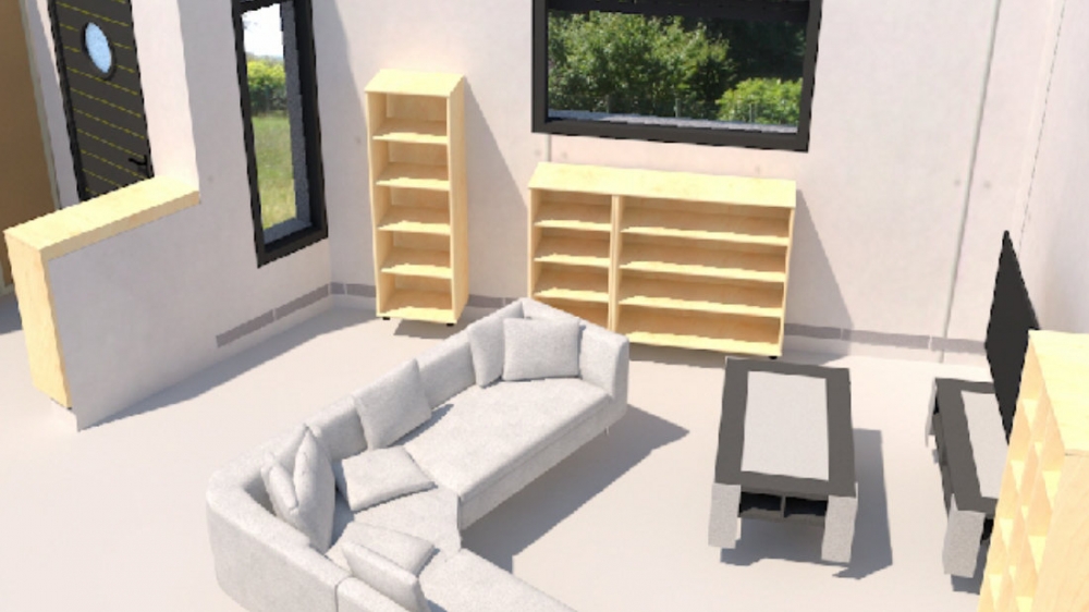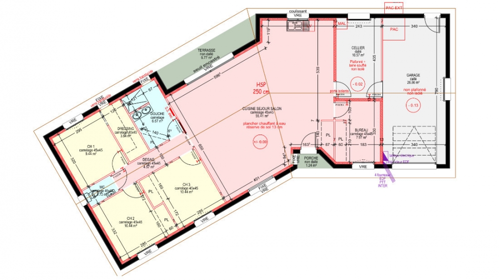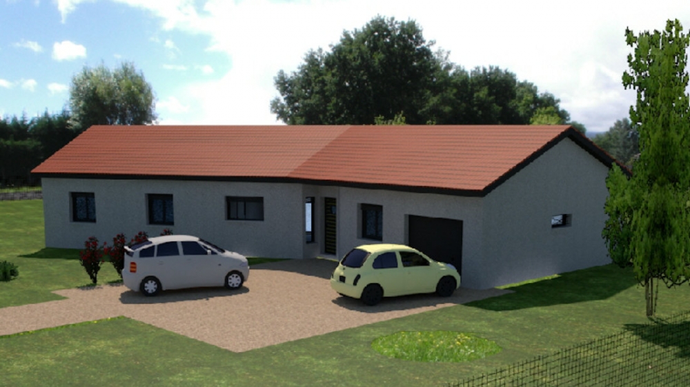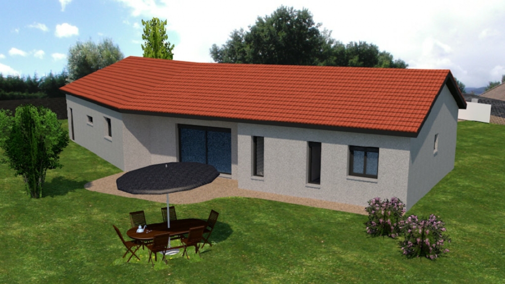 Maison de plain pied avec 3 chambres, un dressing, une cuisine ouverte sur un grand séjour, un bureau, un cellier, un garage, un porche et une terrasse.
