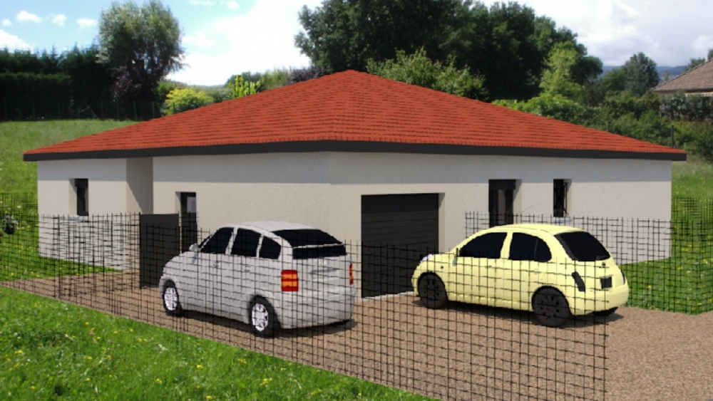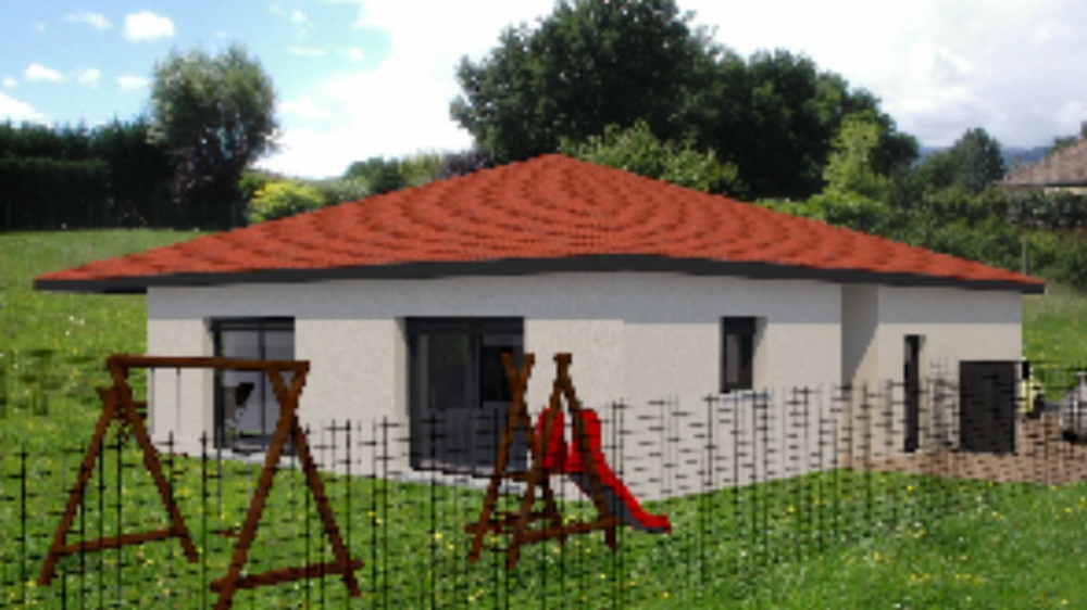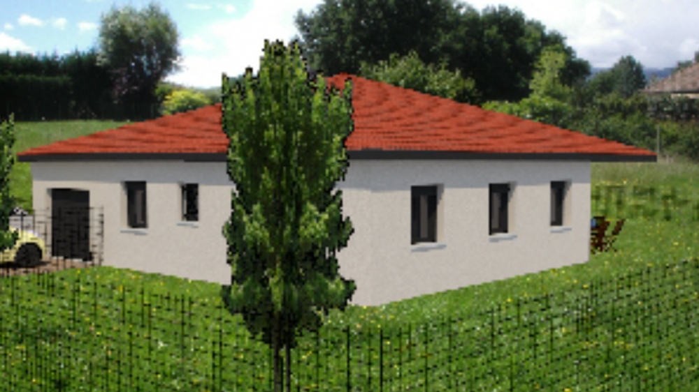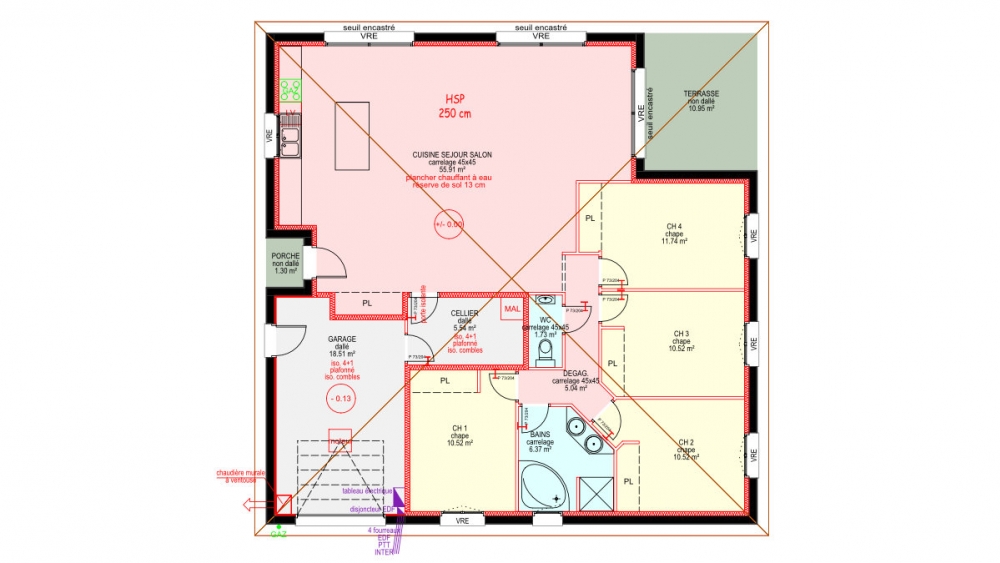 Maison de plain pied avec 4 chambres une cuisine ouverte sur un grand séjour, un cellier, un garage, un porche et une terrasse.