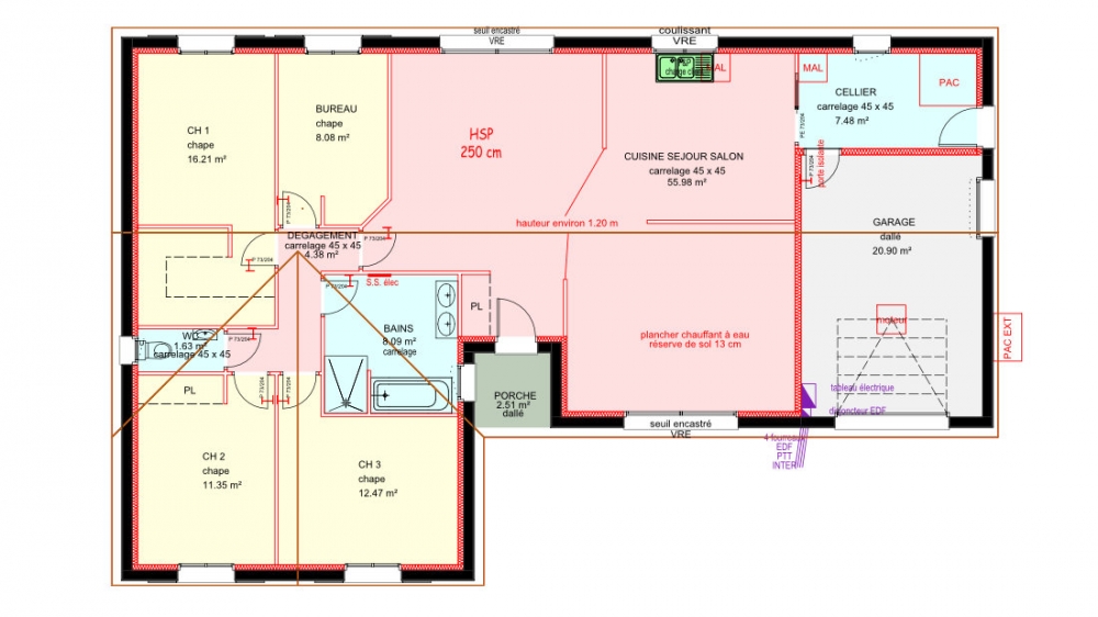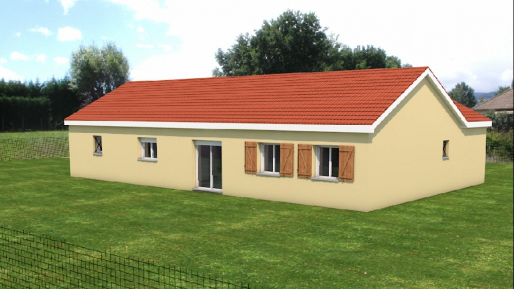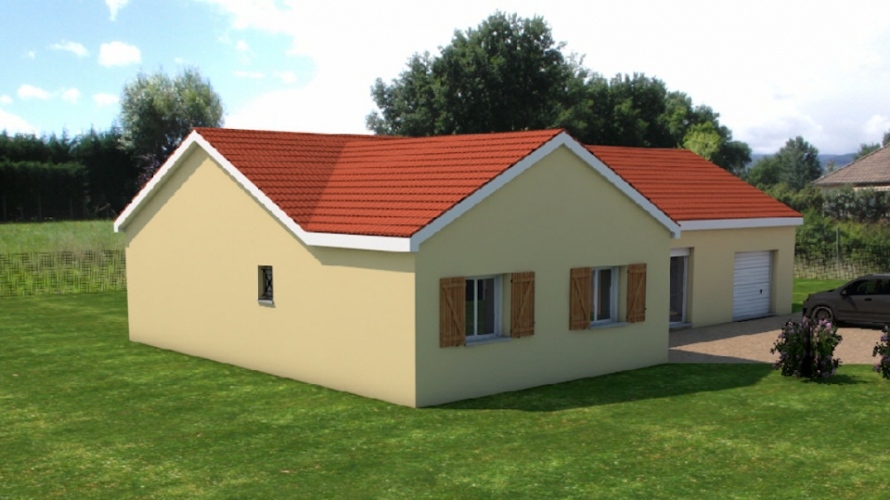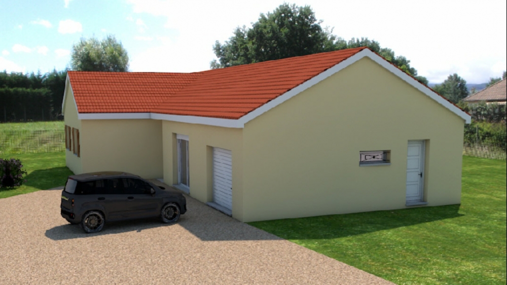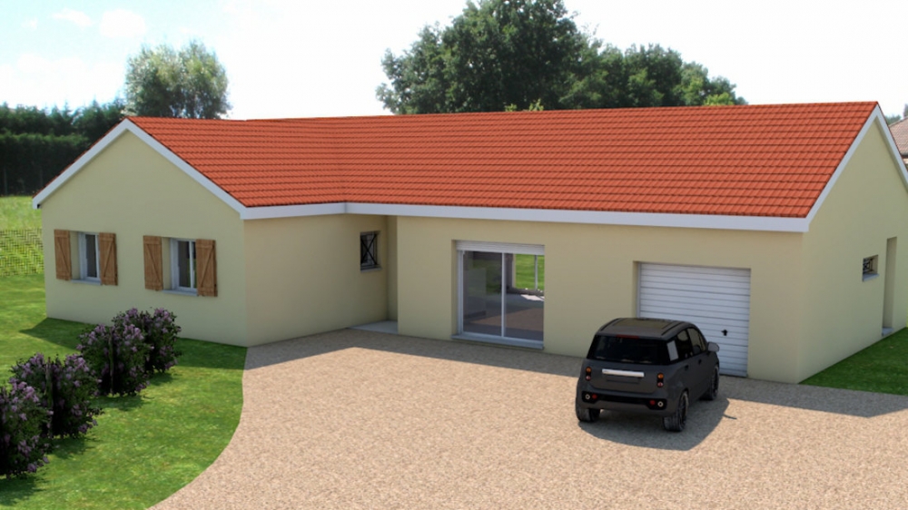 Maison de plain pied avec 3 chambres et un bureau, une cuisine ouverte sur un grand séjour, un cellier et un garage.