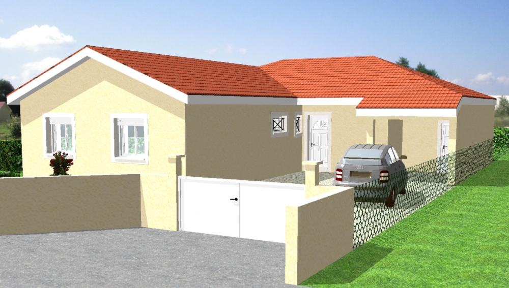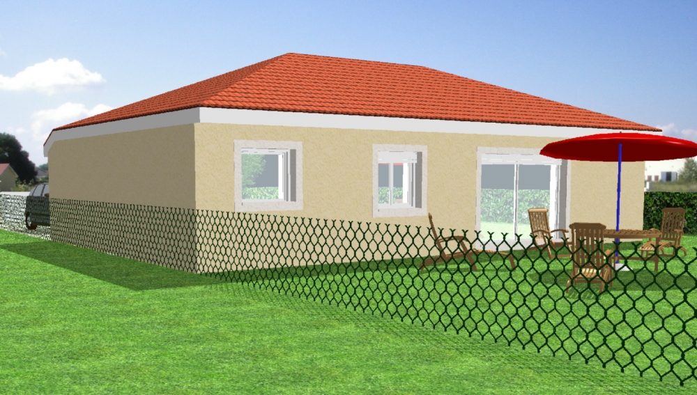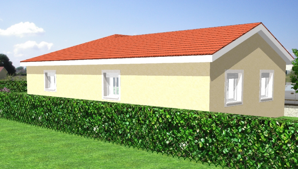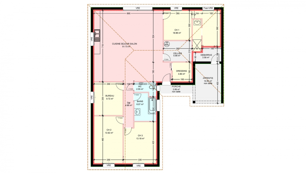 Maison de plain pied avec 3 chambres, un bureau, une cuisine ouverte sur un grand séjour, un dressing, un cellier, un débarras et un appentis.