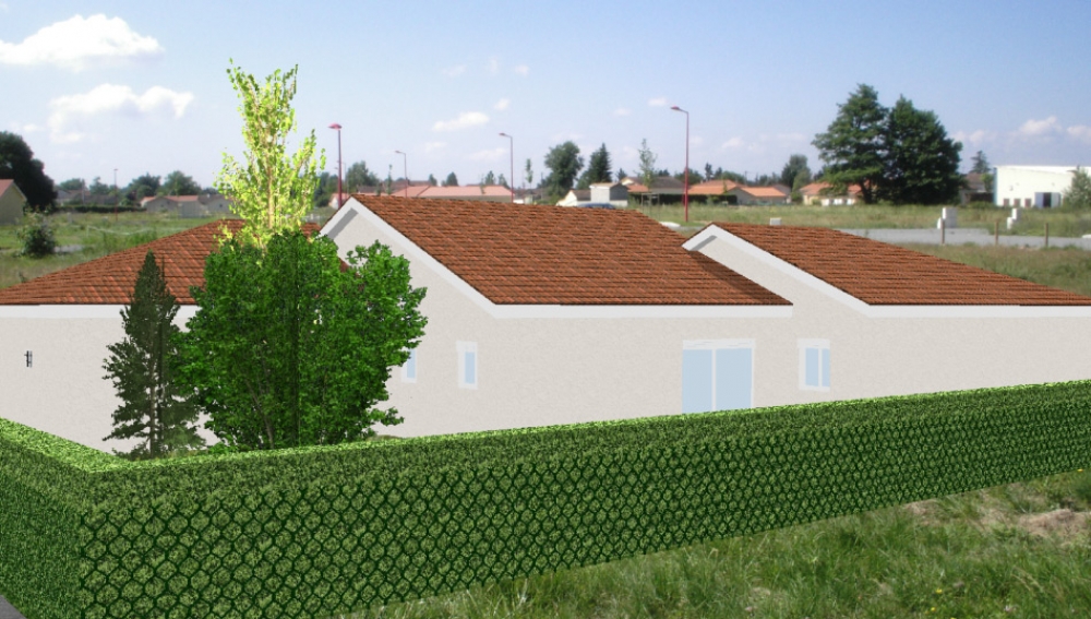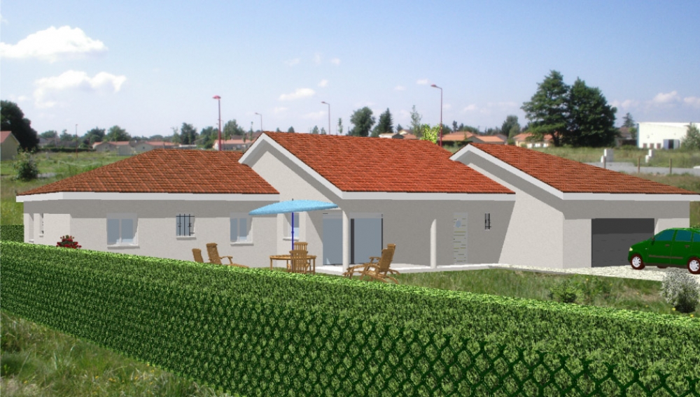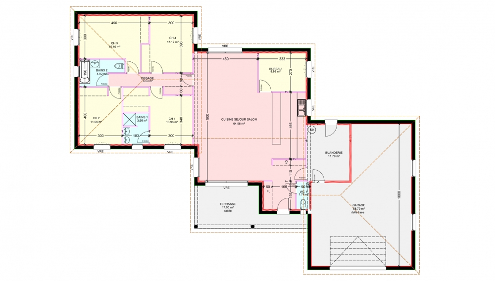 Maison de plain pied avec 4 chambres et un bureau, 2 salles de bains, une cuisine ouverte sur un très grand séjour, une buanderie, une terrasse et un grand garage.