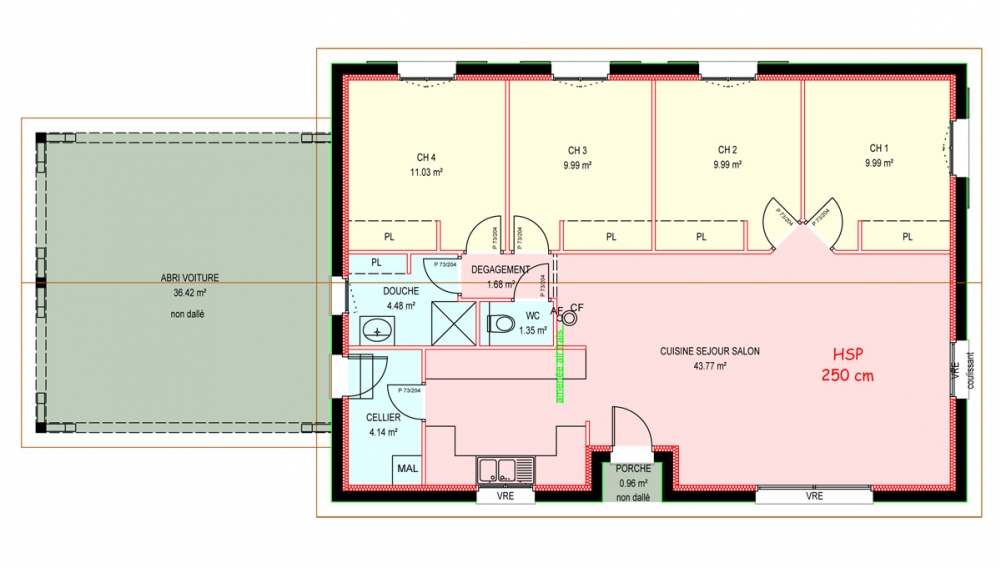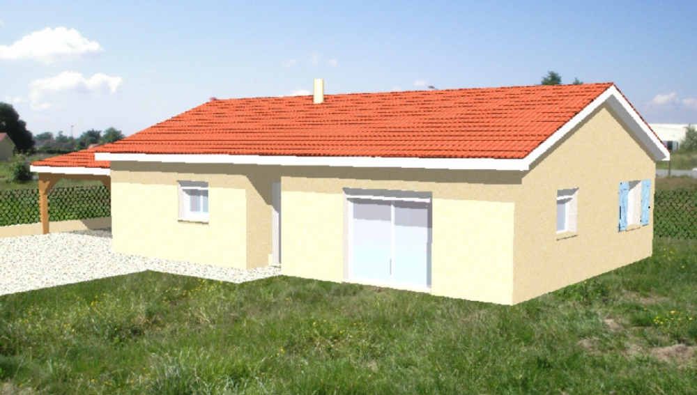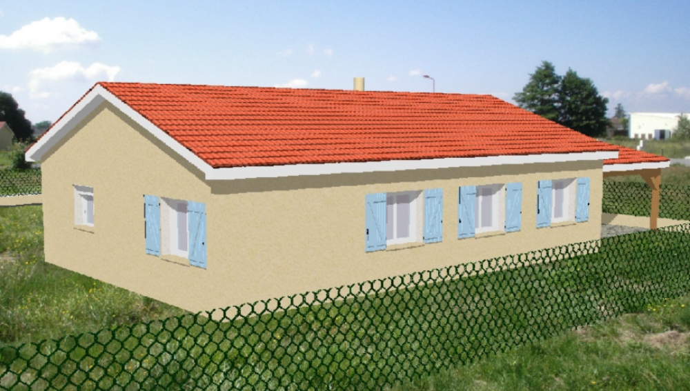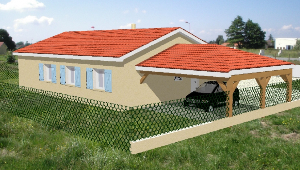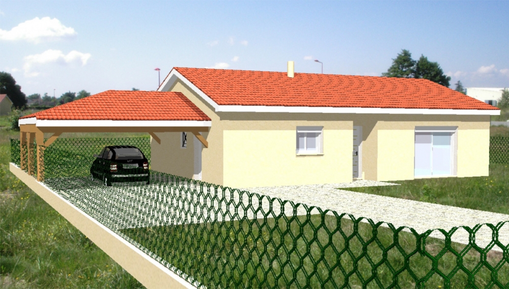 Maison de plain pied avec 4 chambres, une cuisine ouverte sur un grand séjour, un cellier, un porche et un grand abris voiture.